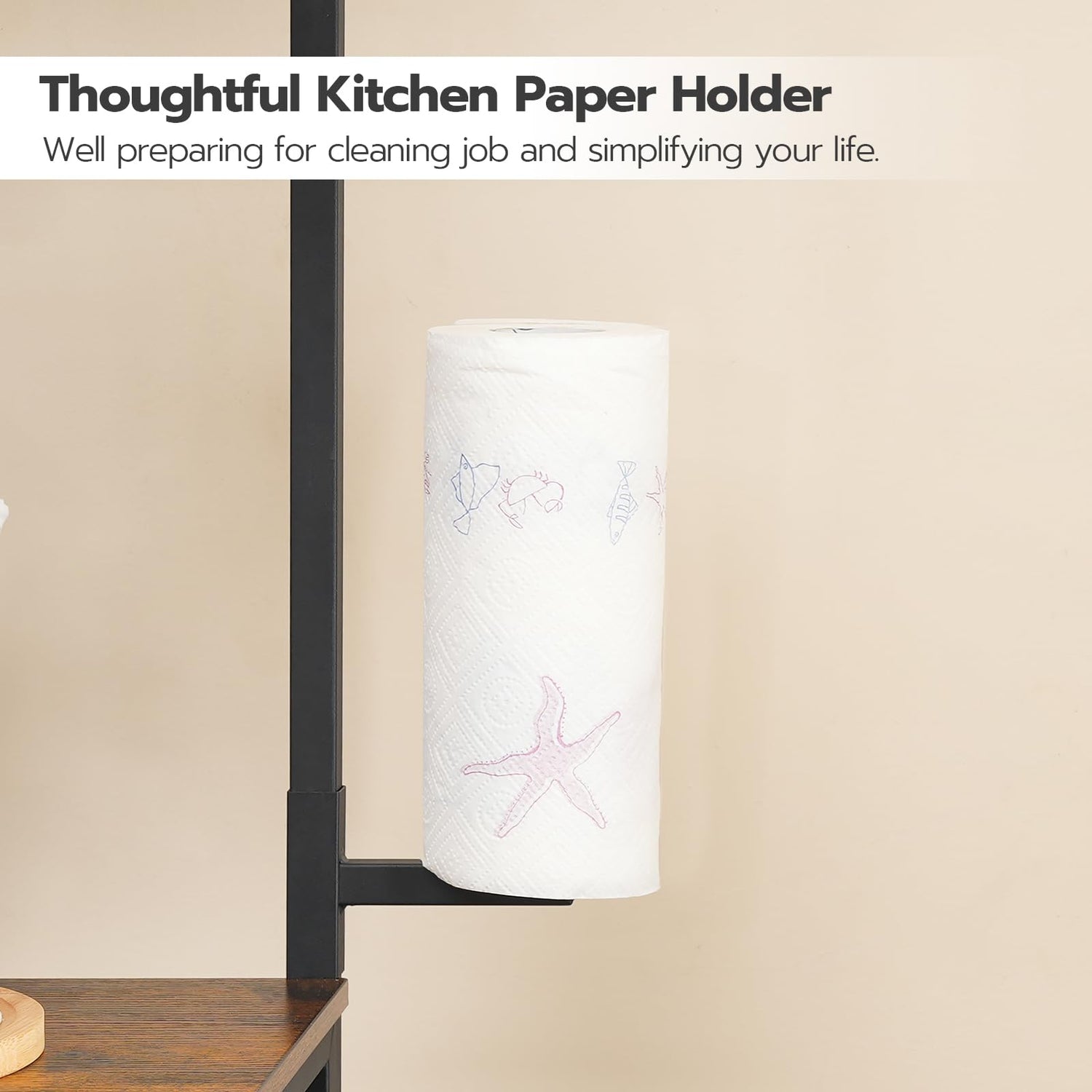 Maximise your organisation with the intelligent design of this bakers rack. It boasts a combination of a spacious drawer, three bottom shelves, and two top shelves, allowing you to keep everything from microwave ovens and coffee makers to your collection of cookbooks neatly arranged and easily accessible. The integrated kitchen roll holder and six S-shaped metal hooks offer additional storage options for towels, dishcloths, and more, ensuring your kitchen remains tidy and organised.