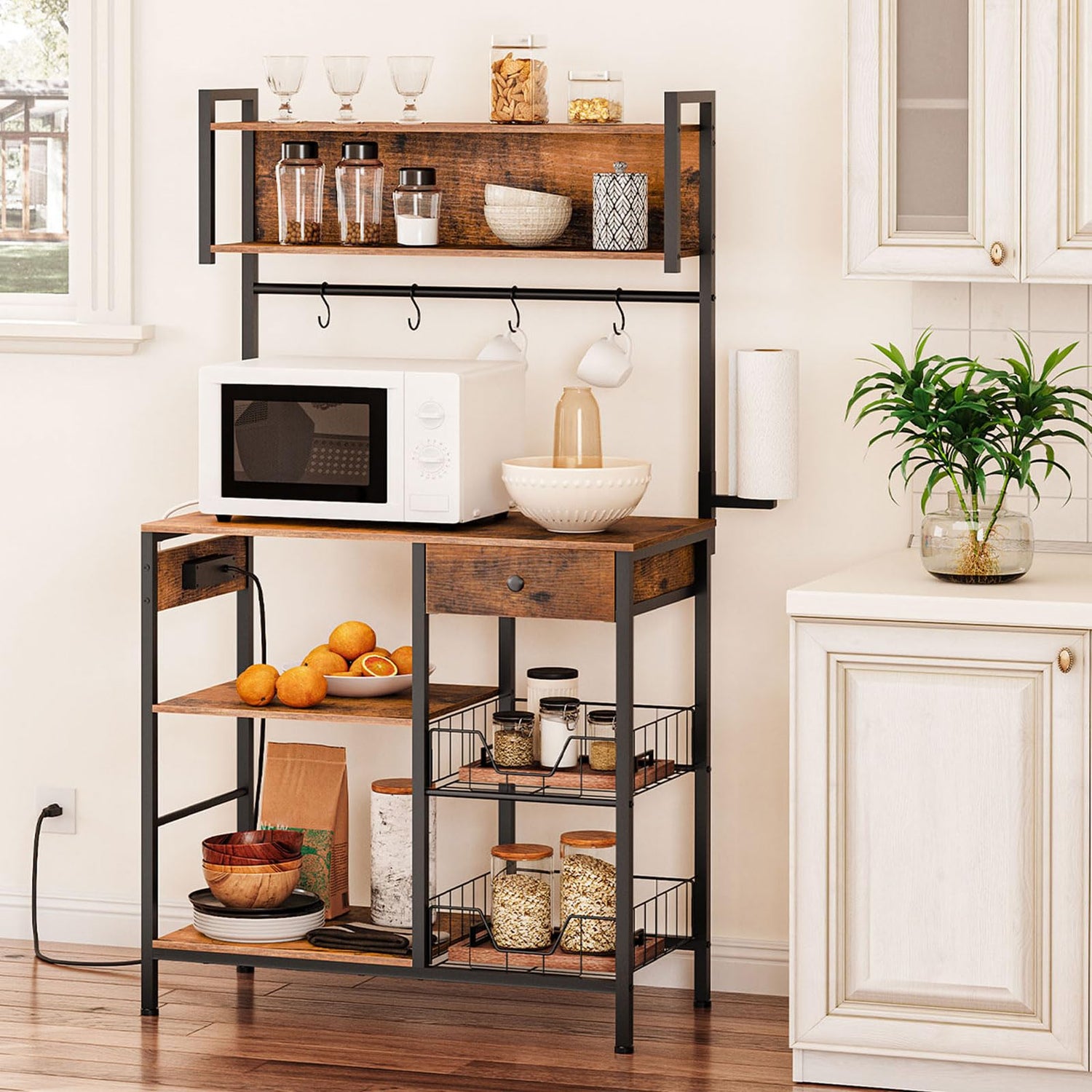 HOOBRO Rustic Brown and Black 5-Tier Bakers Rack with Power Outlets, Microwave Stand, and Storage Baskets