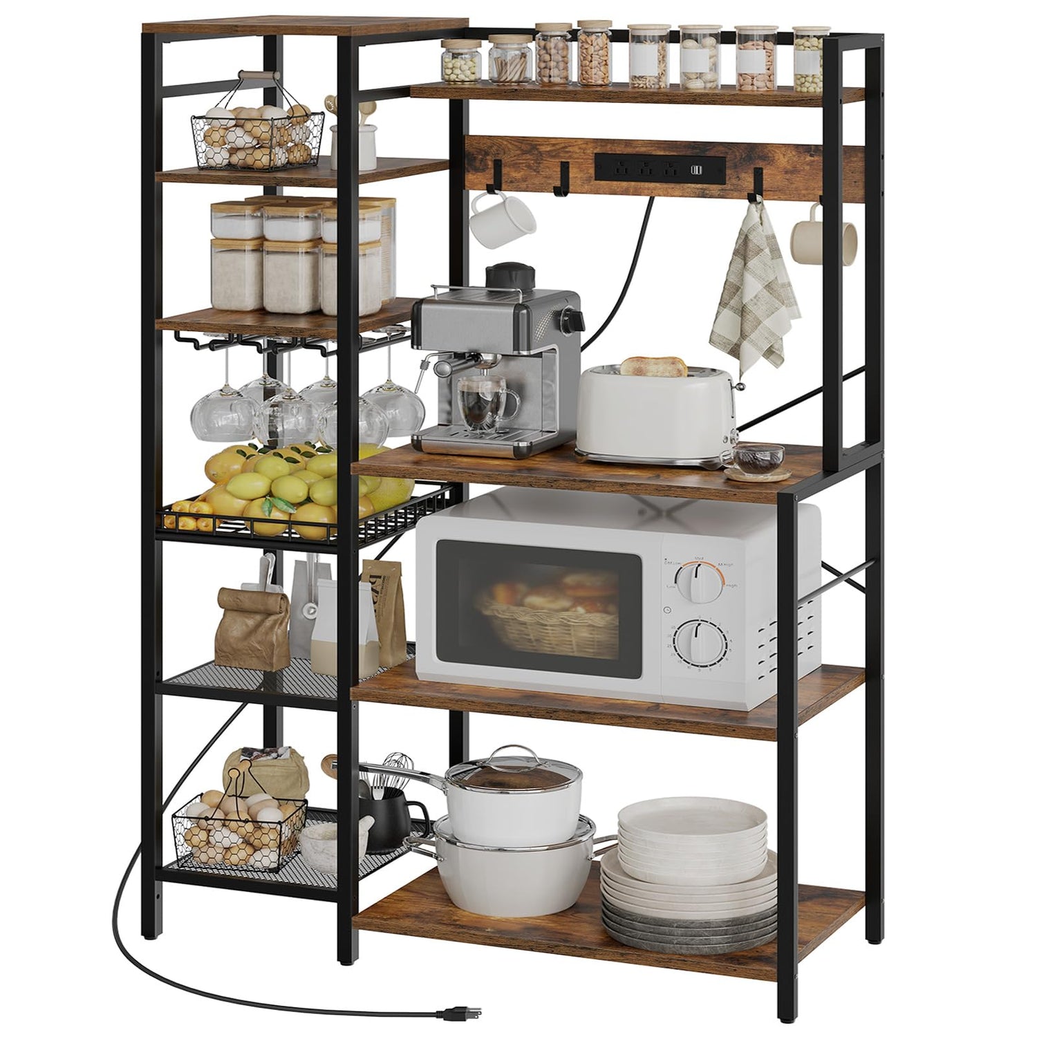 - Space Optimization: This bakers rack combines a shelf, wine glass holder, hooks, and charging station, solving all your kitchen storage woes in one stop. From daily dishes to spice bottles to your finest wines, everything finds its place