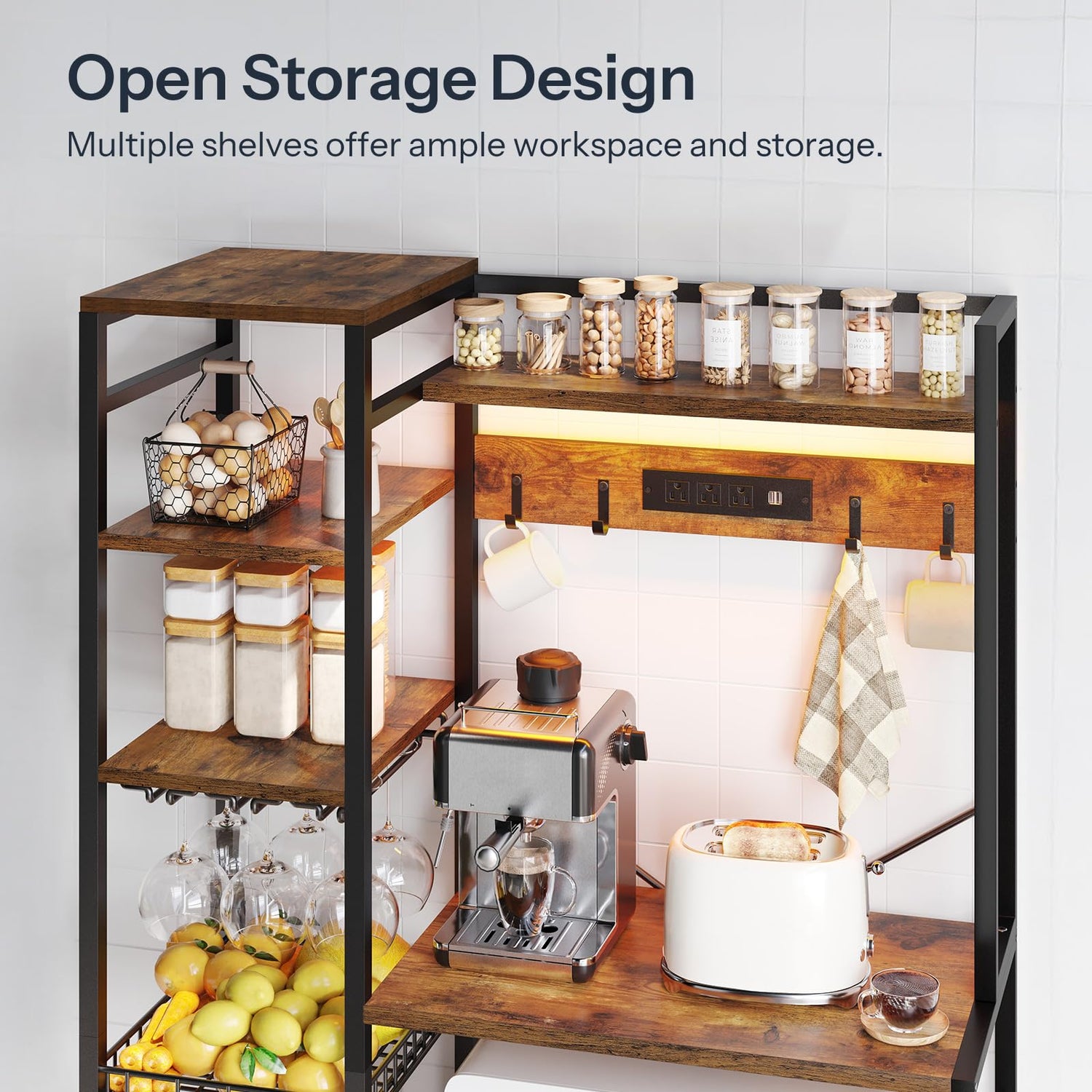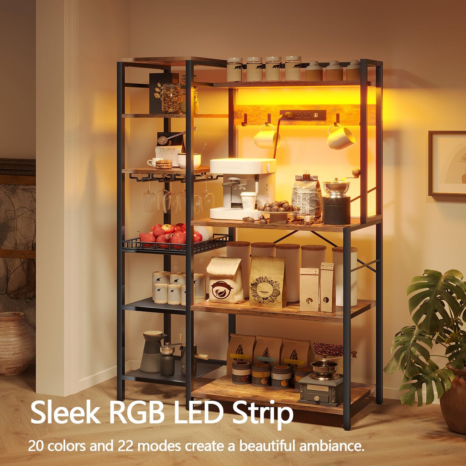 - Convenient Living: The large bakers rack features 3 AC outlets and 3 USB ports (1 hidden on the socket back), meeting all your charging needs. The color-adjustable RGB LED strip adds a cozy glow to your kitchen at night, making even waiting time enjoyable