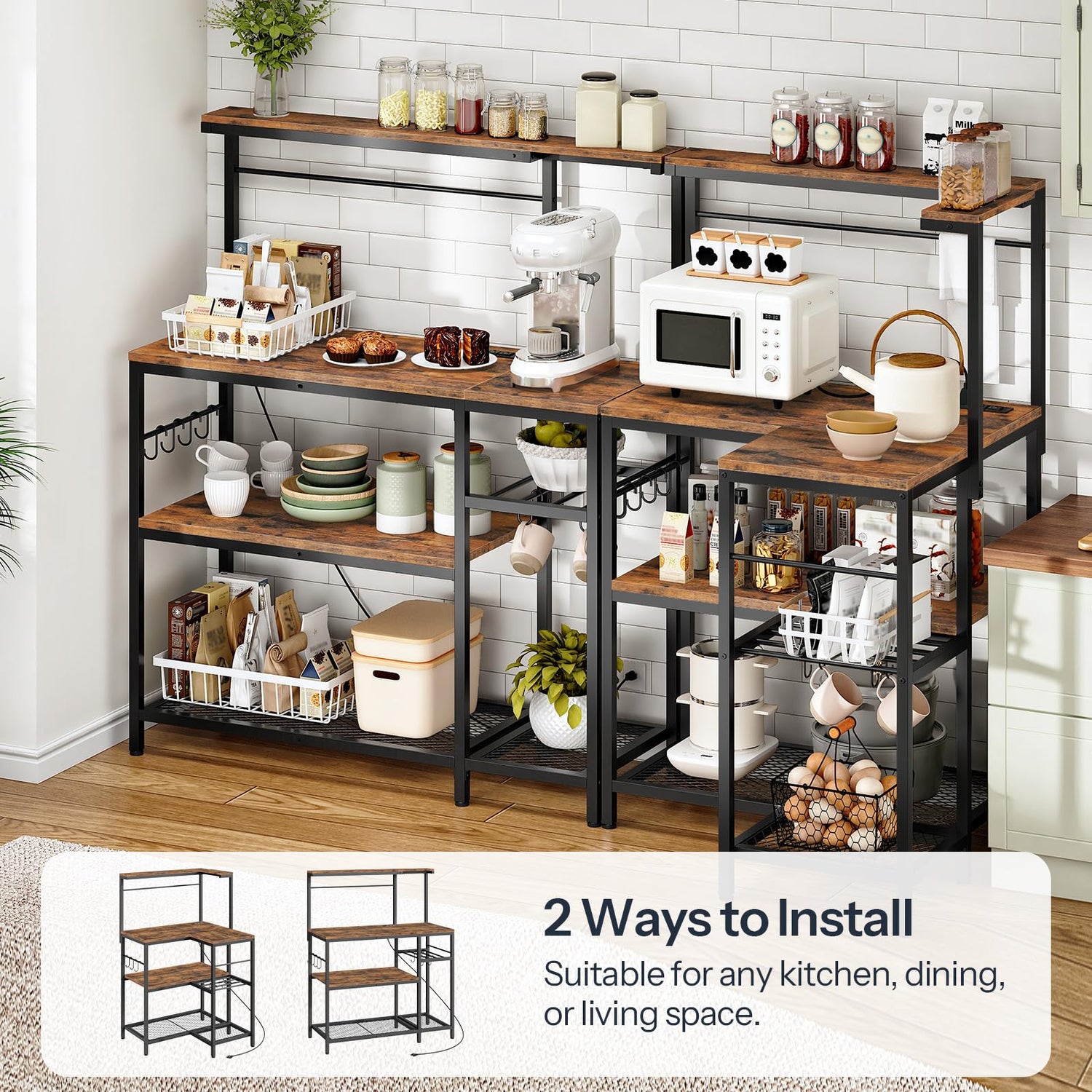 - Flexible Assembly with Two Options: With 2 setup methods (horizontal or L-shaped), this bakers rack for kitchens fits any home layout, especially corner spaces. Using the baker rack as a functional corner bakers rack, coffee bar station, plant stand, or book shelf, this kitchen backers rack can meet all