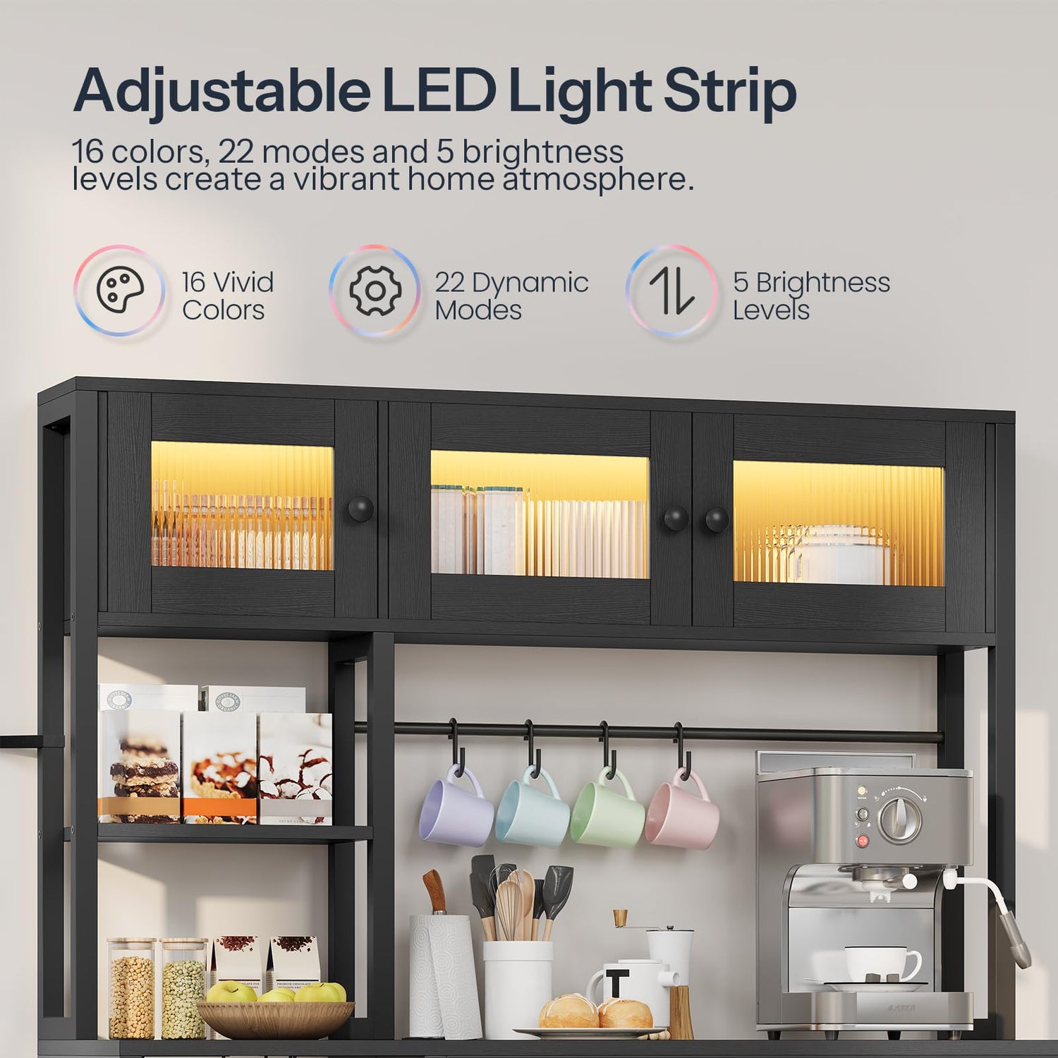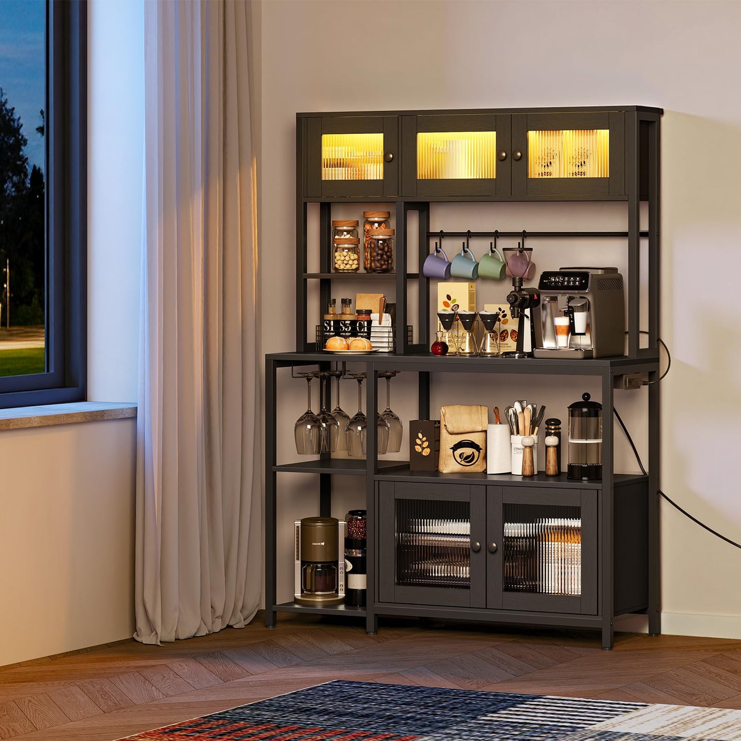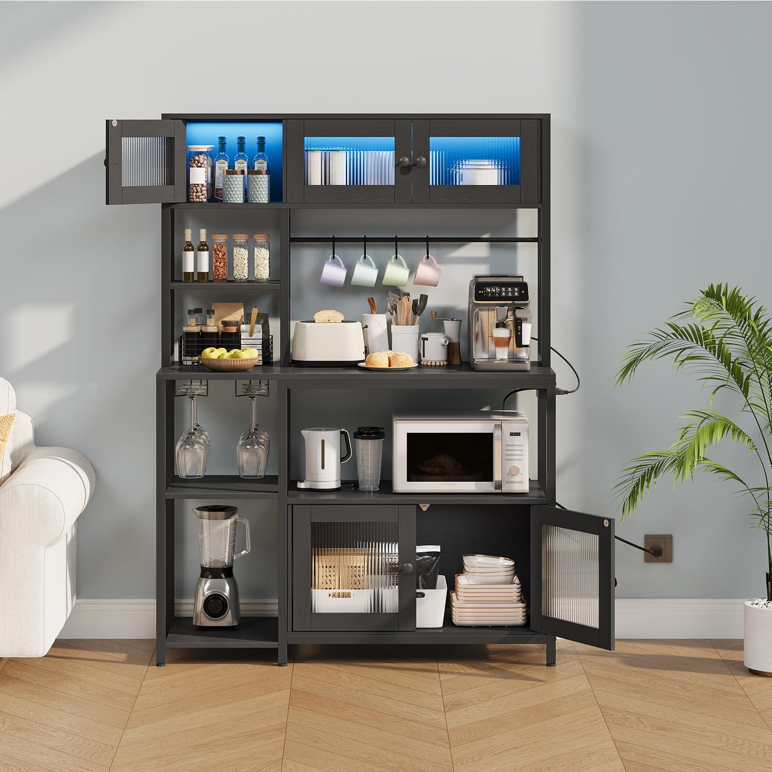 HOOBRO Bakers Rack with Power Outlet and LED Light, 45.3 Inch Microwave Stand with Shelves, Coffee Bar Cabinet with Wine Rack & 4-S Hooks, Kitchen Utility Storage Shelf with Cabinet, Black BB16UDHB01