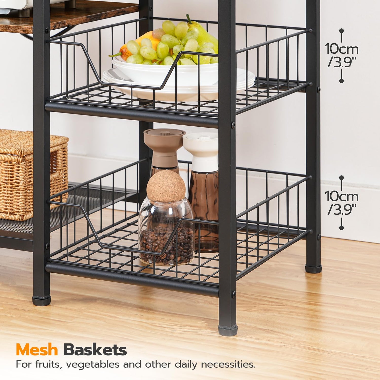 - Spacious and Functional: The bakers rack for Kitchen with Storage has 6 shelves, 2 storage baskets and 4 hooks, capable of storing almost all your kitchen utensils. Even as a coffee bar shelf, a plant rack, bookshelf or printer stand, its well-arranged shelves offer ample storage options