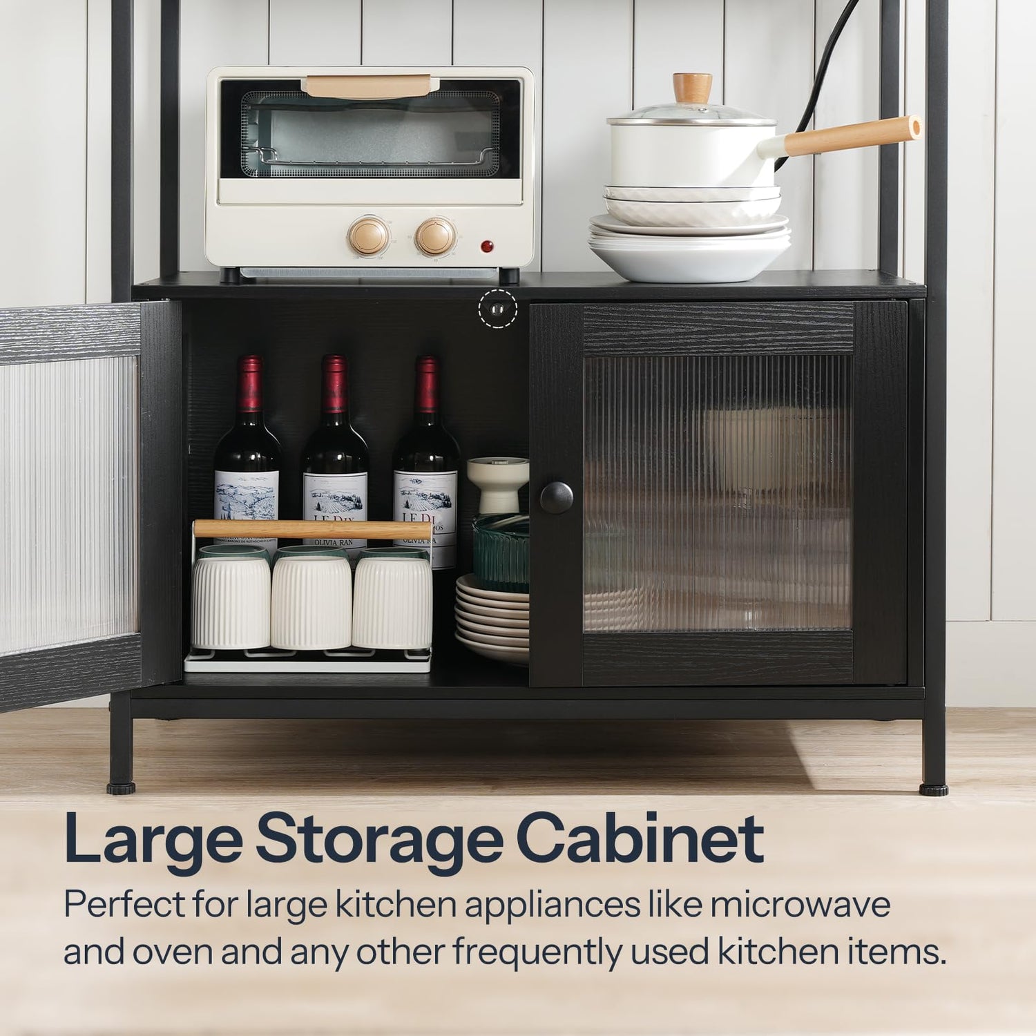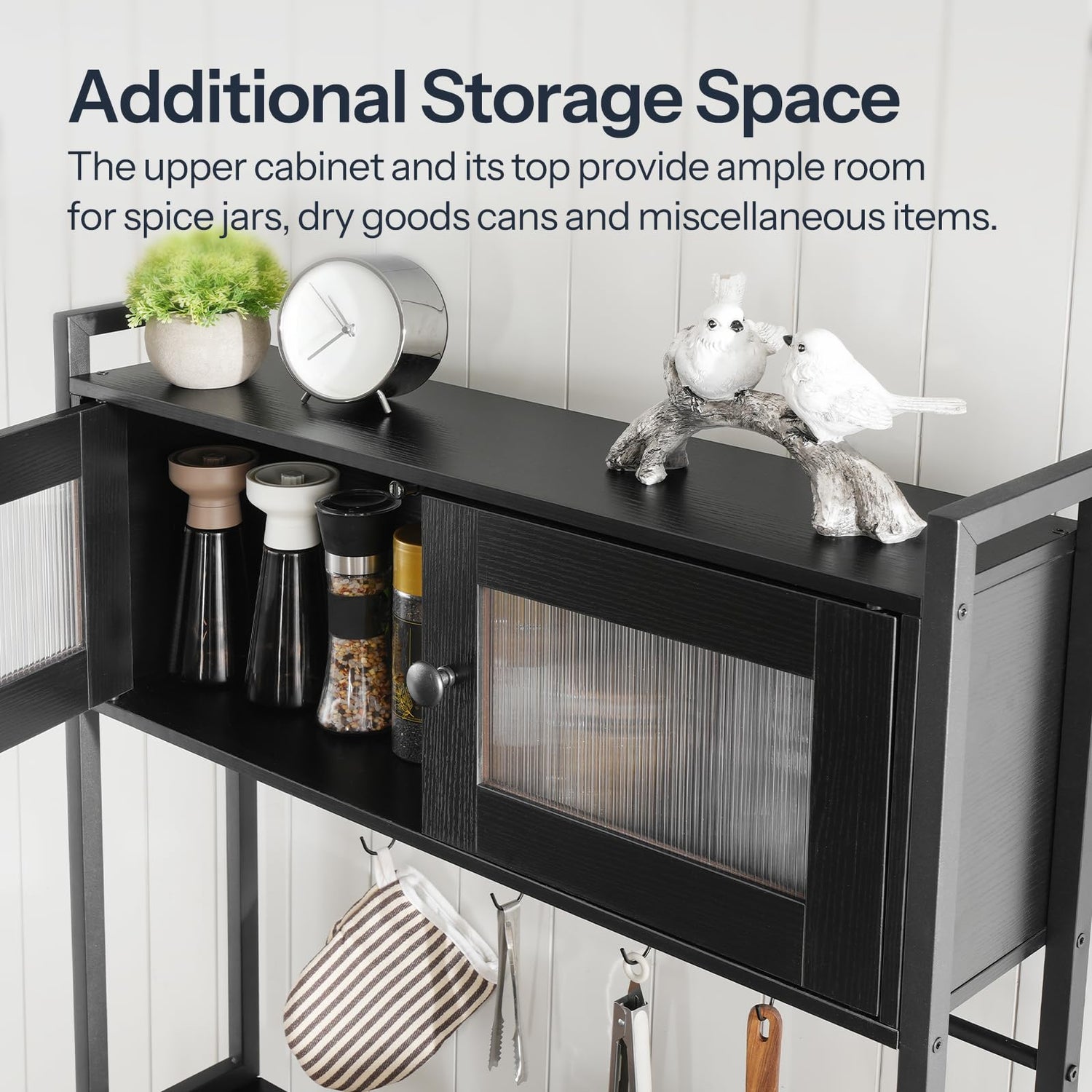 - Multi-Tier Storage: The bakers rack with cabinets and open shelves is an excellent storage for organizing baking tools and ingredients. The partially see-through cabinet doors enable you to view the contents while protecting them from dust and ensuring easy access