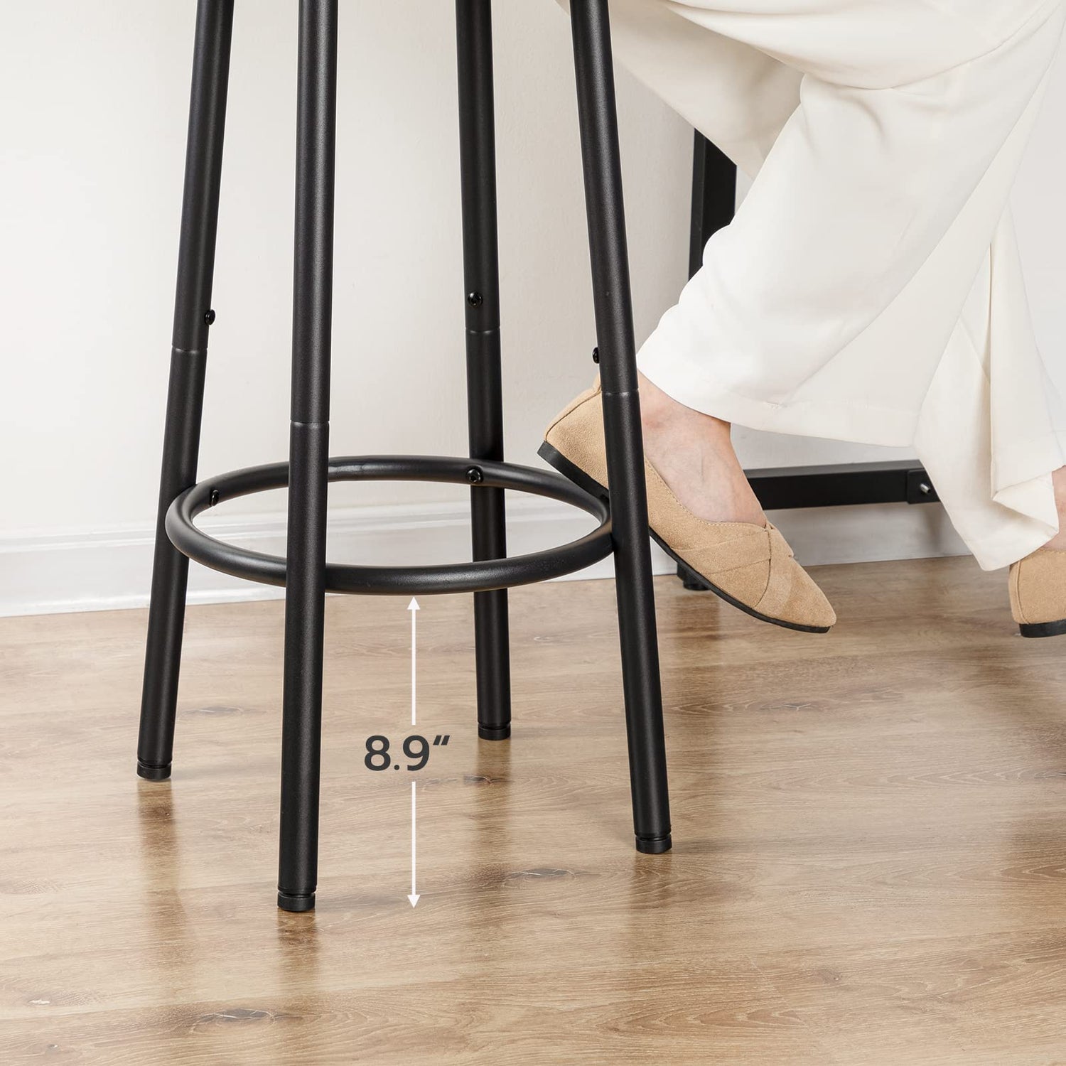 - Quality Material: Made of high-quality particleboard, the bar stool top is smooth and easy to clean, preventing sharp corners from scratching the clothes. The panel is paired with thickened metal legs and foot support ring