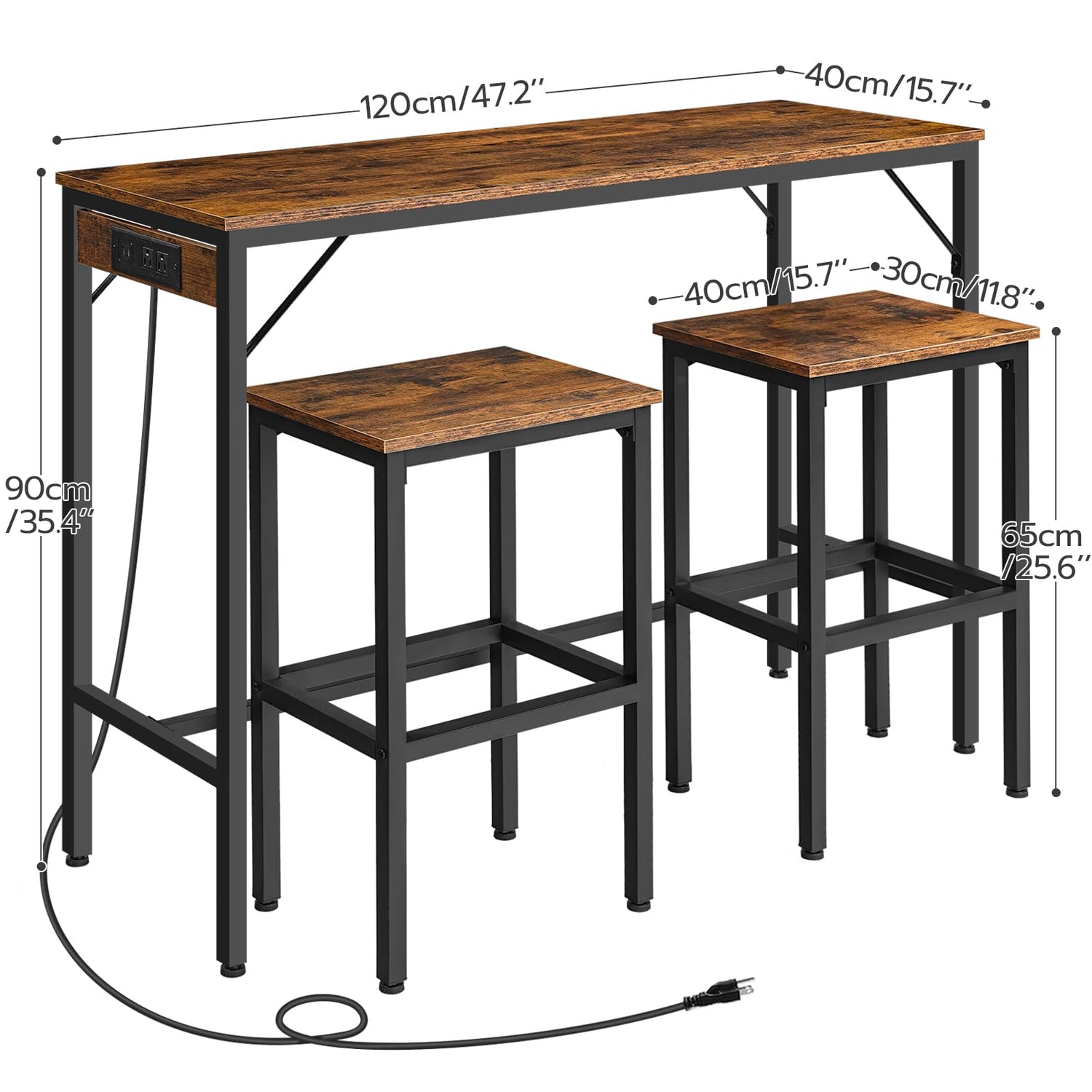 HOOBRO Bar Table and Chairs Set, 47.2" Dining Table Set with Power Outlet, 3-Piece Pub Table Set, Kitchen Bar Height Table with Stools of 2, Space Saving for Living Room, Rustic Brown BF46UBT01