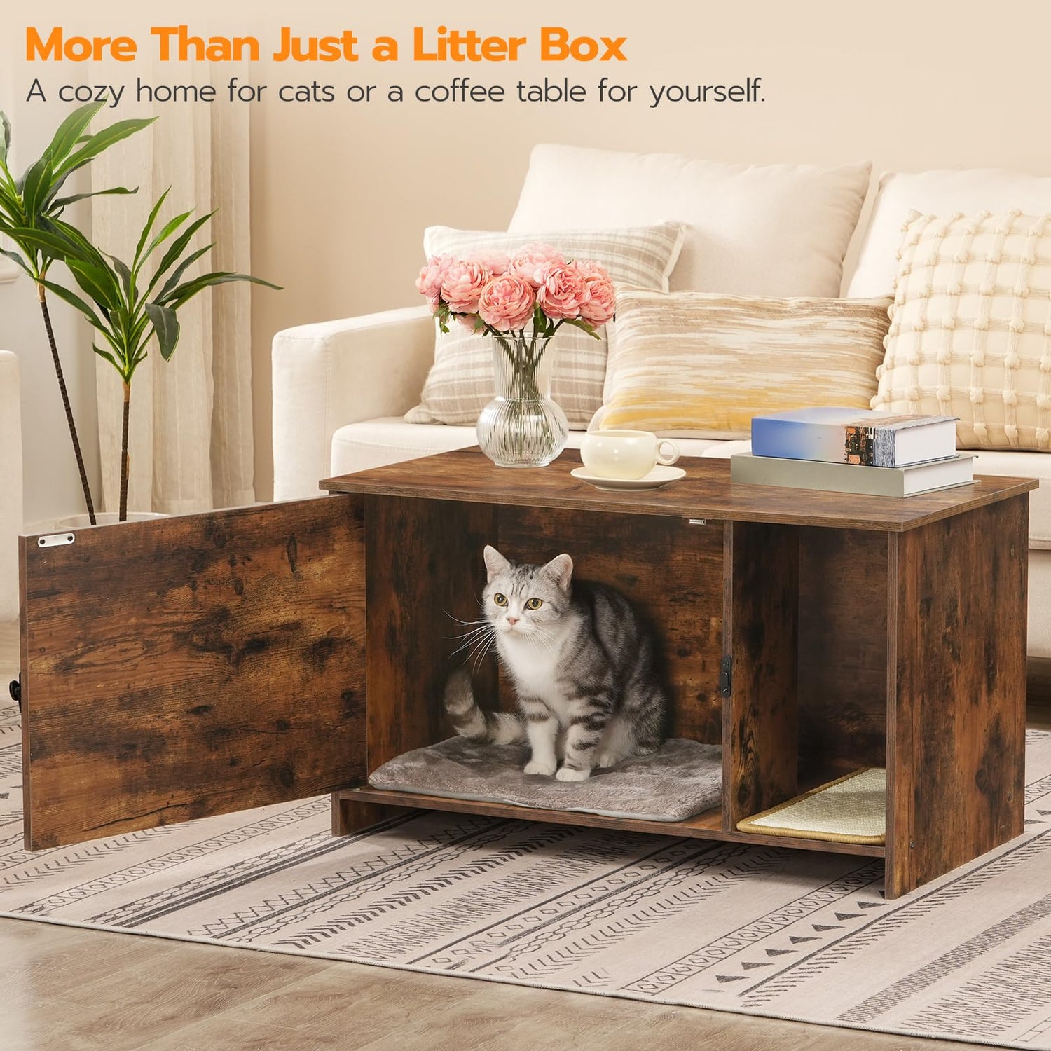 HOOBRO Cat Litter Box Enclosure with Rattan Door, Hidden Litter Box Furniture, Litter Box Enclosure with Adhesive Cat Scratching Mat, Coffee Table, 31.4" L x 17.7" W x 18.1" H, Rustic Brown FY18MW01