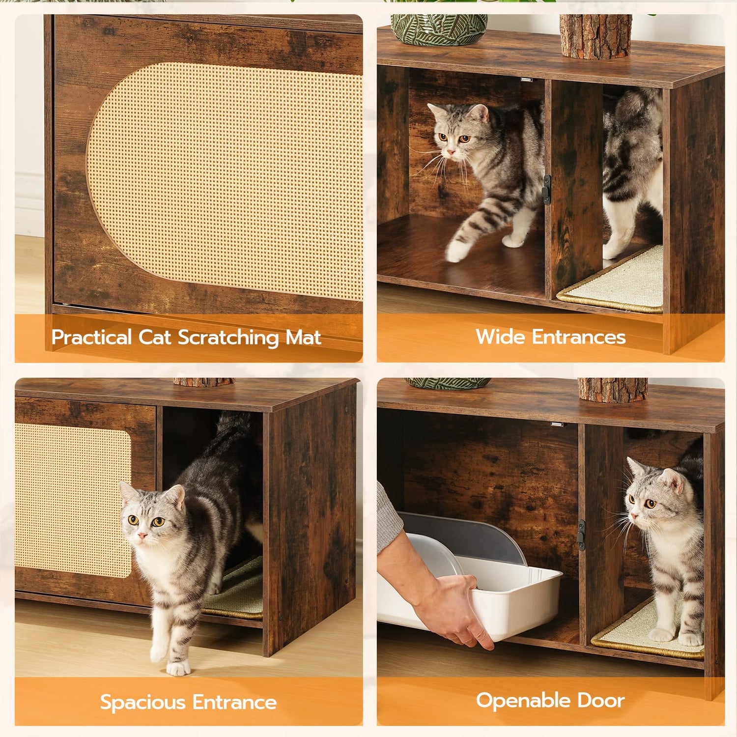 - Stylish Cat Litter Box: This cat litter box has a door with faux rattan decoration, adding a natural touch to your home. The rustic brown finish complements any indoor decor with fine texture, elevating your existing layout style