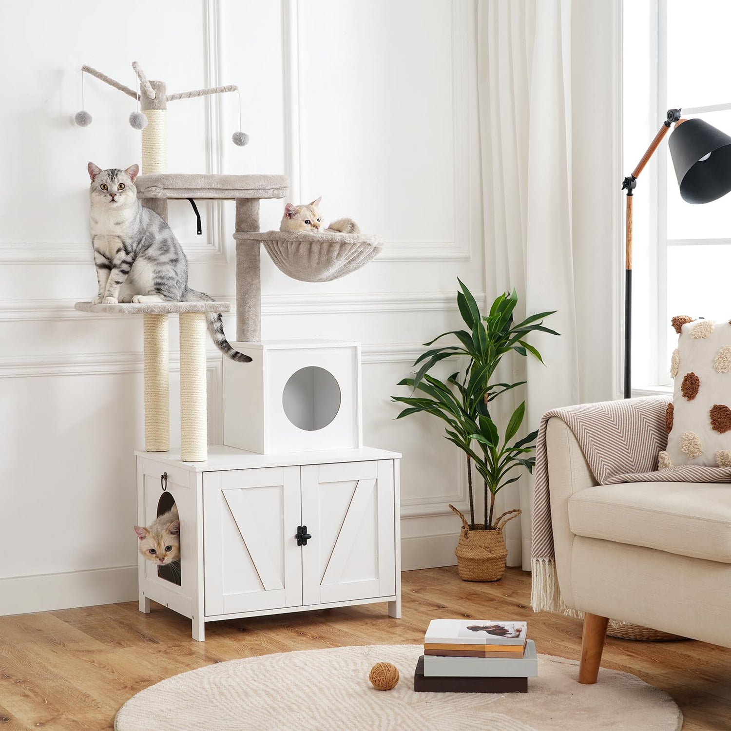 HOOBRO Cat Tree Tower with Litter Box Enclosure for Indoor Cats, Wooden Cat Condo with Scratching Posts, Cat Litter Box Furniture Hidden, All-in-One Cat Toy with Cat House, White WT15MZ03