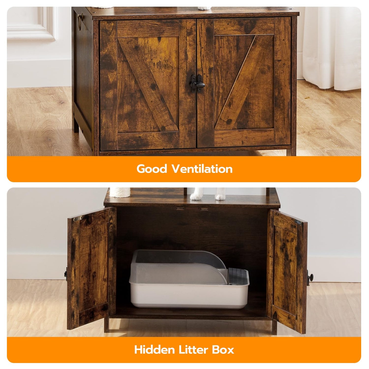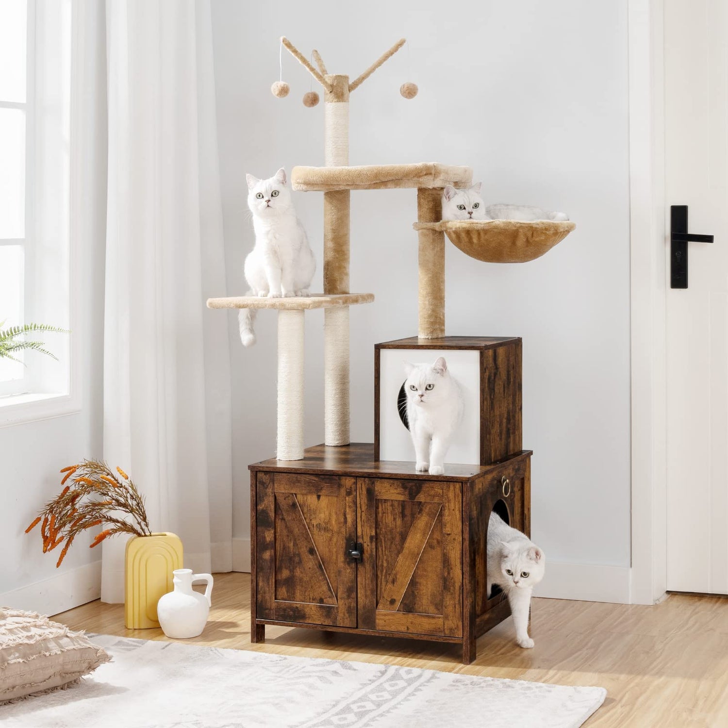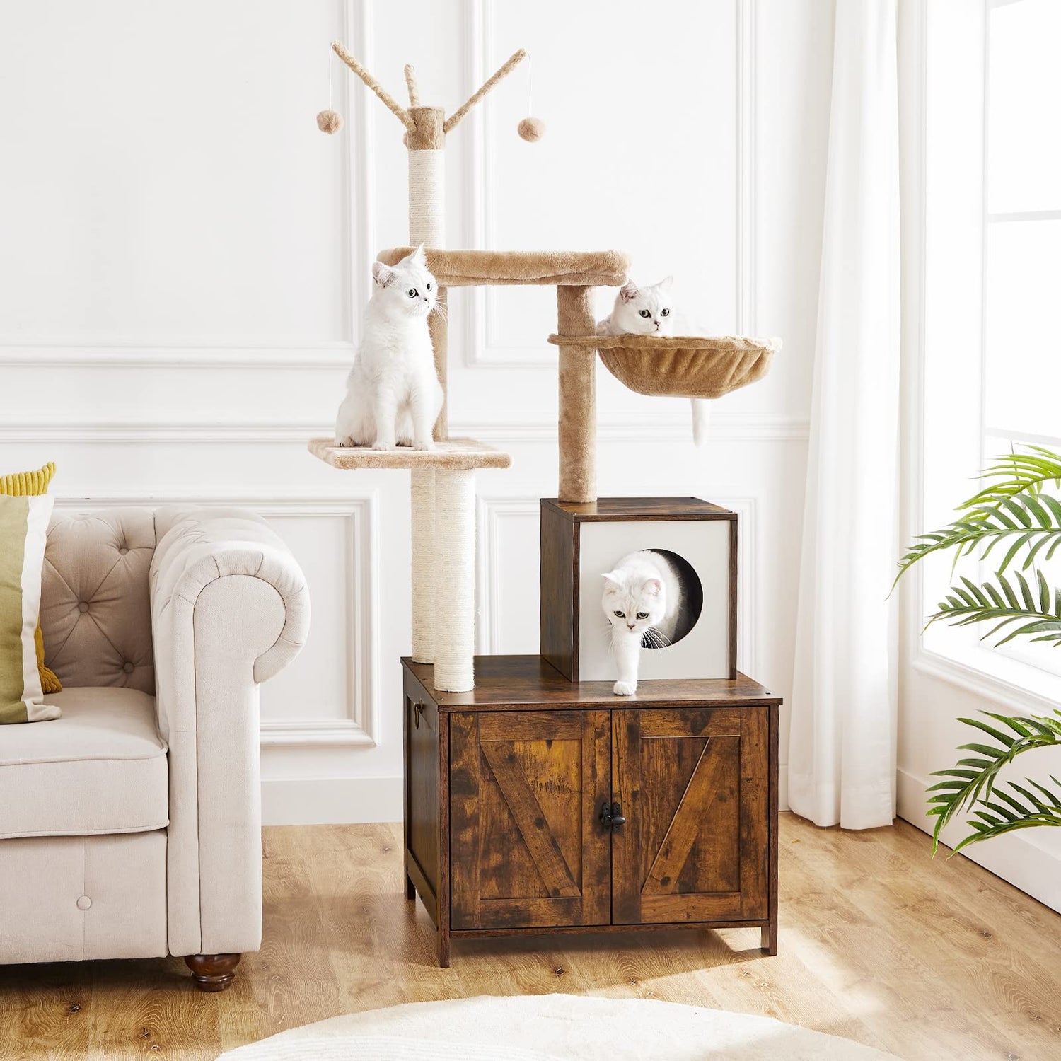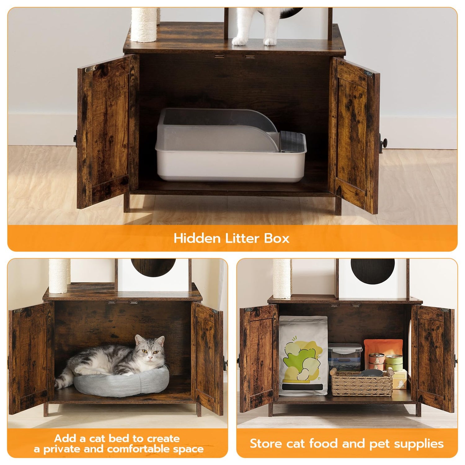 HOOBRO Cat Tree with Litter Box Enclosure for Indoor Cats, Wooden Cat Condo with Scratching Posts, Cat Litter Box Furniture Hidden, All-in-One Cat Toy with Cat House, Rustic Brown FG15MZ03