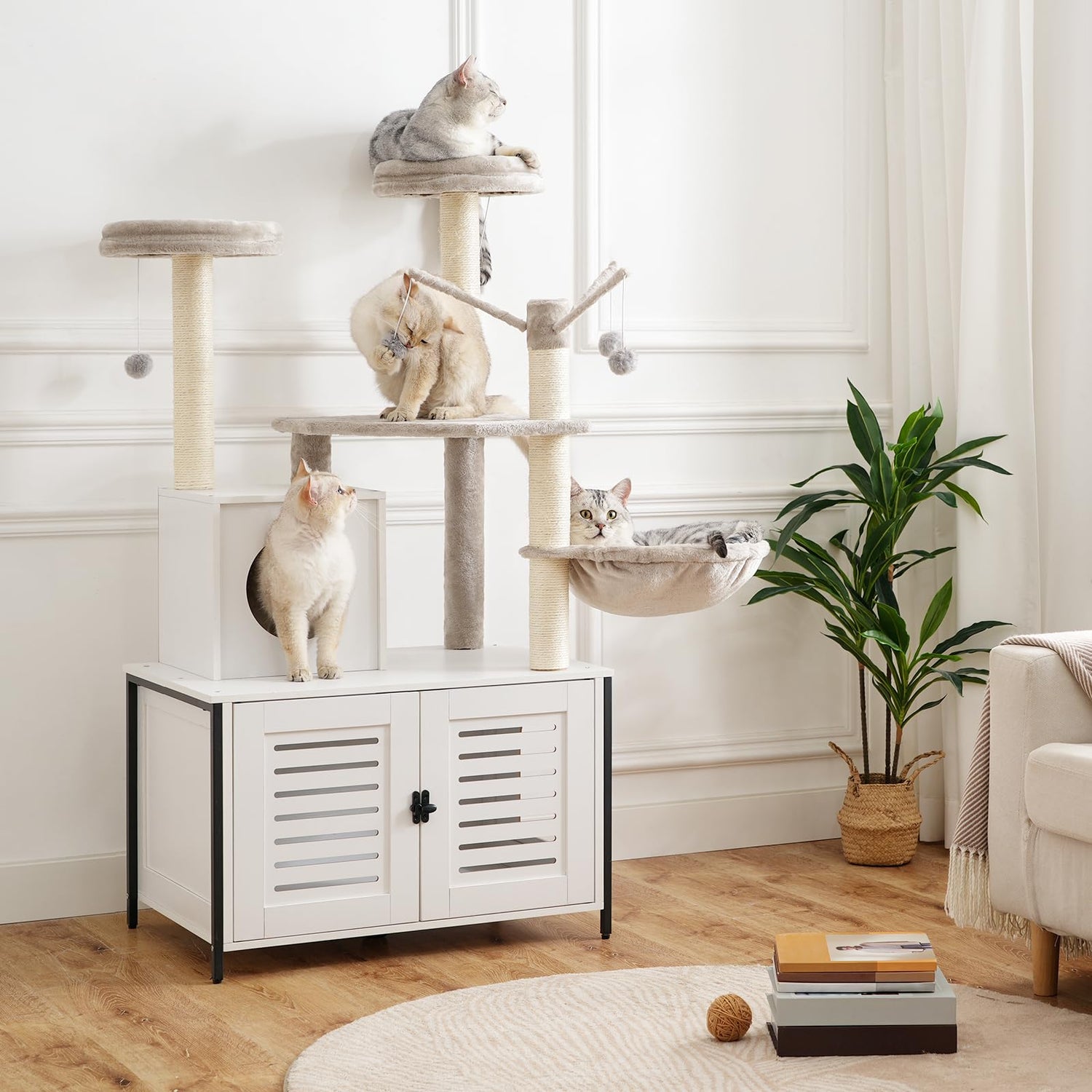 HOOBRO Cat Tree with Scratching Posts, Cat Tower Litter Box Enclosure Furniture for Indoor Cats, All-in-One Wooden Cat House Condo with Cat Hammock, Detachable Teaser Sticks, White BW14MZ03