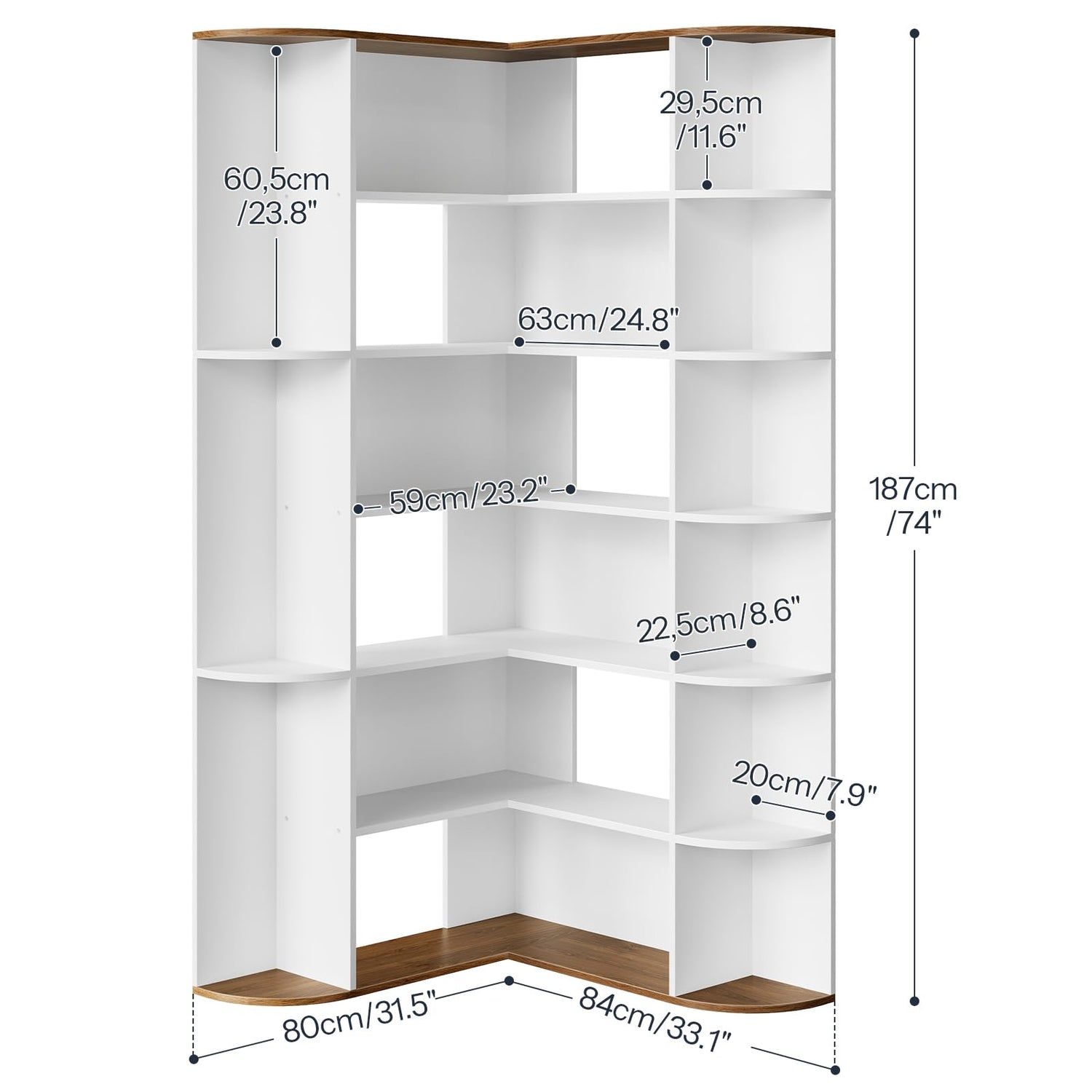 - Ample Vertical Storage & Display Space: This 74" tall corner bookshelf cornerprovides generous vertical storage for books, decor, plants, and more. The smart layout keeps items organized and easily accessible, turning any corner into a functional display area