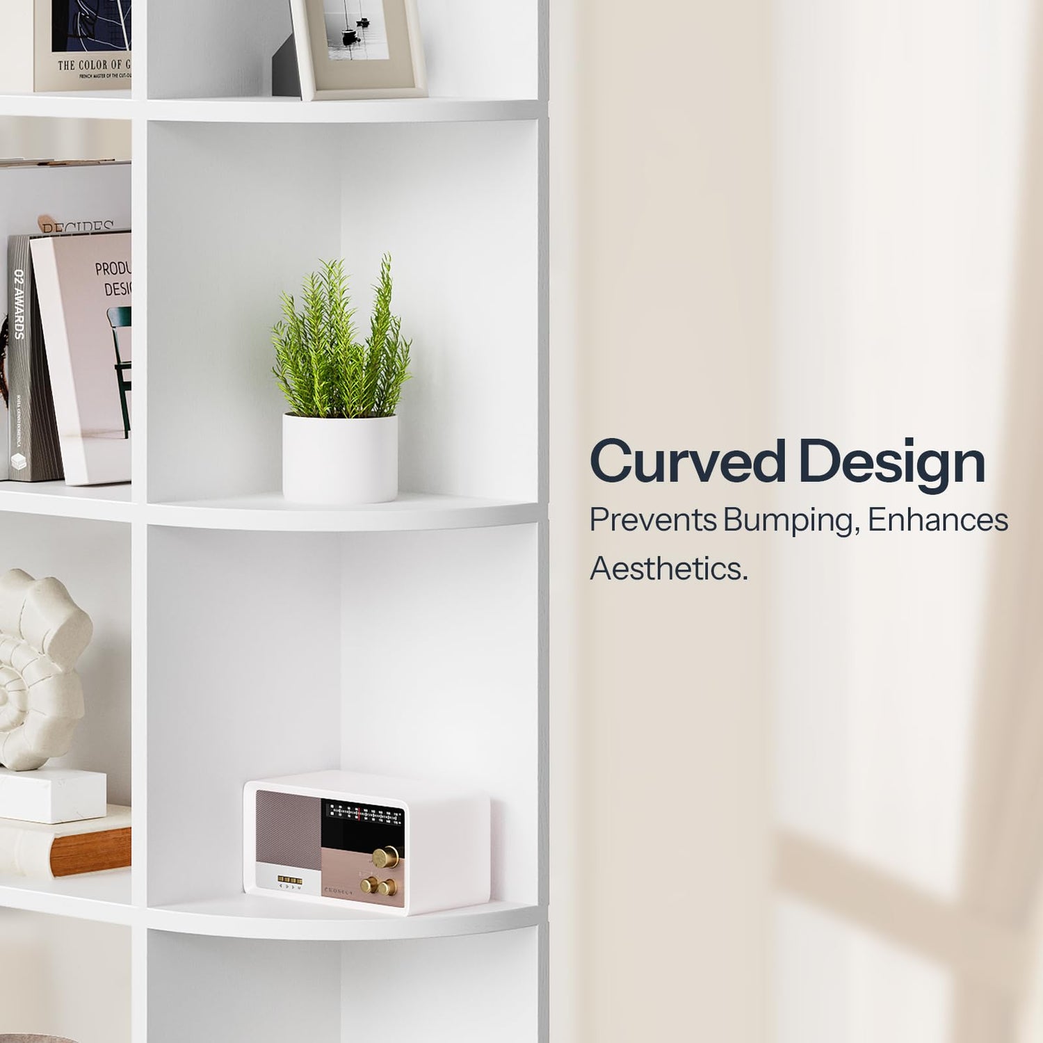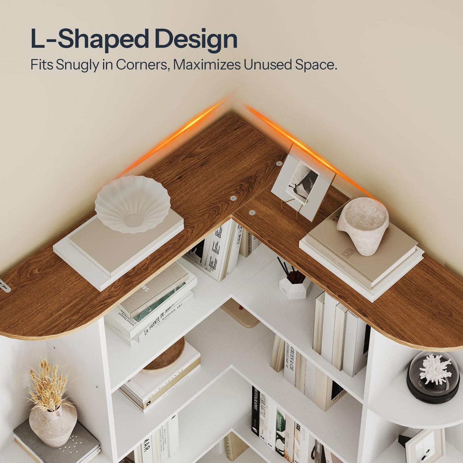 - Modern Design with Soft Curved Edges: Featuring a simple semi-open design with smooth rounded corners, this L-shaped bookcase blends effortlessly into various decor styles while adding a touch of modern elegance and a softer aesthetic