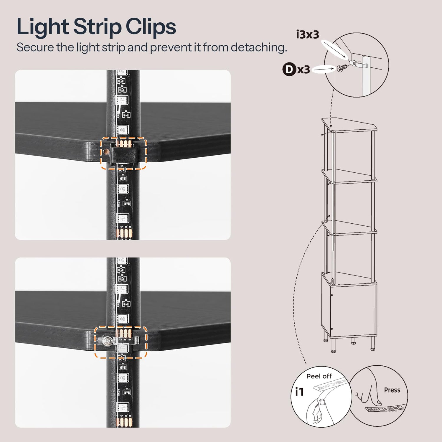 - LED light strip: The corner bookshelf features a colorful LED light strip with multiple dynamic modes, easily switchable via remote or phone. The personalized lighting enhances displayed items, making the display corner more captivating