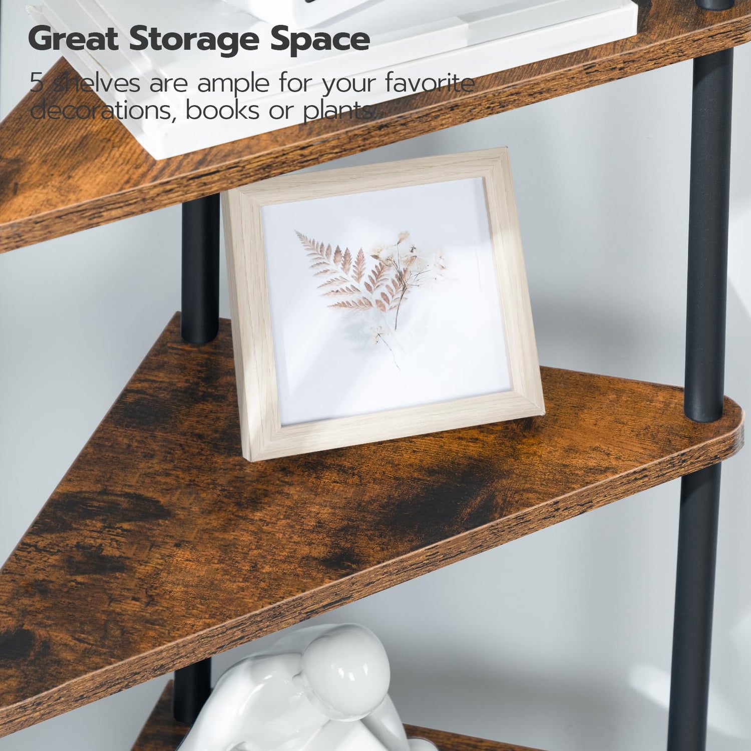 HOOBRO Corner Shelf Stand, Industrial 5-Tier Corner Bookshelf with Metal Frame, Plant Corner Display Shelf, Corner Bookcase for Small Spaces, Bedroom, Living Room, Rustic Brown BF33CJ01
