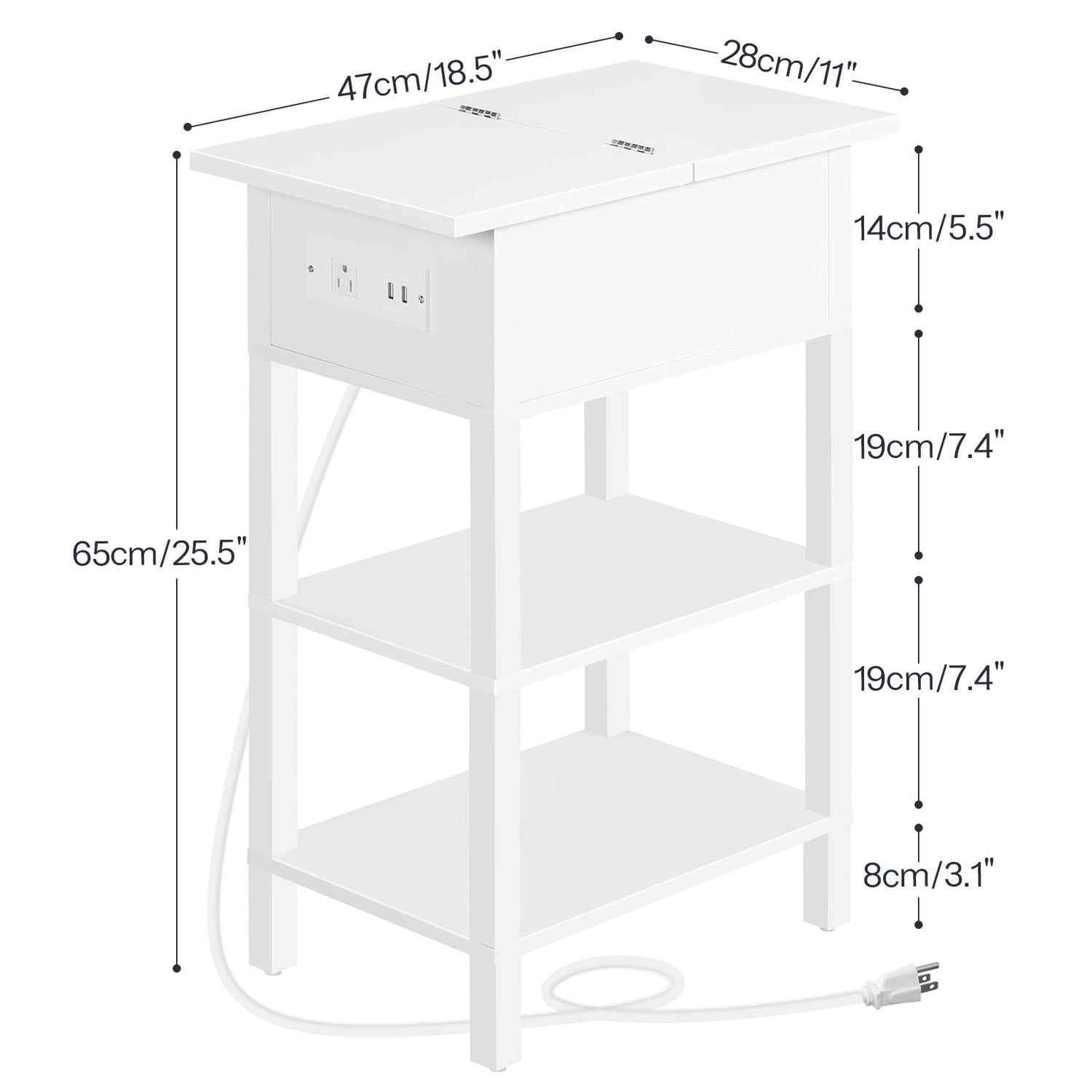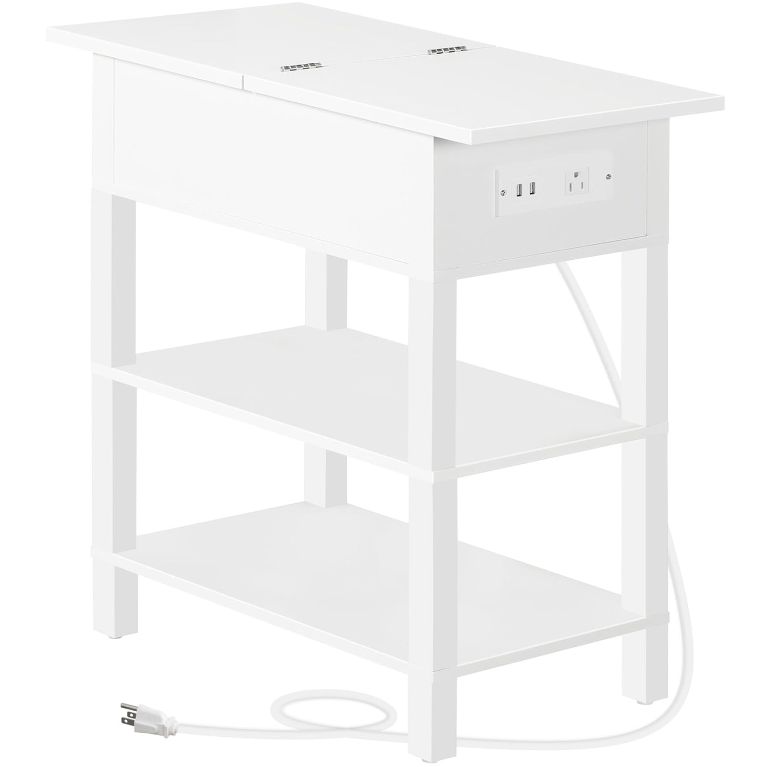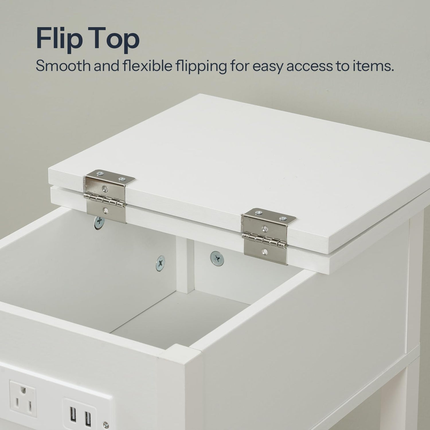 HOOBRO End Table with Charging Station, Flip Top Side Table with USB Ports, Narrow Nightstand Bedside Tables with Storage Shelves, for Small Space, Living Room, White WT141UBZ01