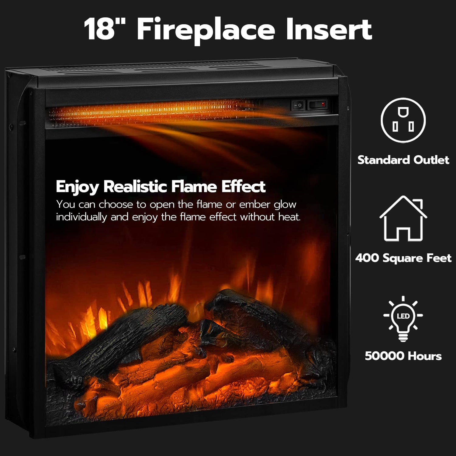 - TV Stand with Electric Fireplace: This TV stand is designed with reserved place for a 18” electric fireplace that has 2 separate switches for heating setup and realistic 3D flames. This fireplace console with electric fireplace will help you get through the cold winter happily even though you are in a spacious house because the fireplace’s heating area is up to 400 square feet. Additionally, the effects of gorgeous dancing flame and burning logs add a warm and chic atmosphere to your home
