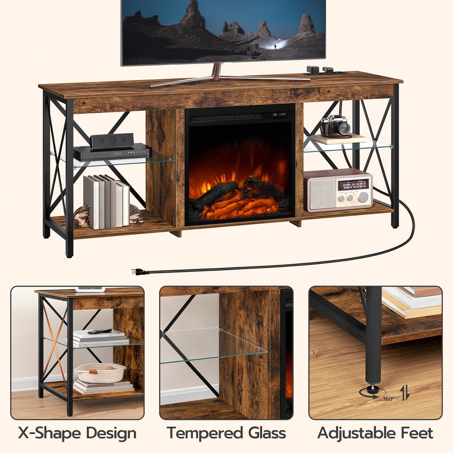 HOOBRO Fireplace TV Stand with Led Lights and Power Outlets, Wooden Media Entertainment Center Console Table with Glass Shelves, Fireplace TV Console for TVs up to 65", Rustic Brown BF140UDDS01