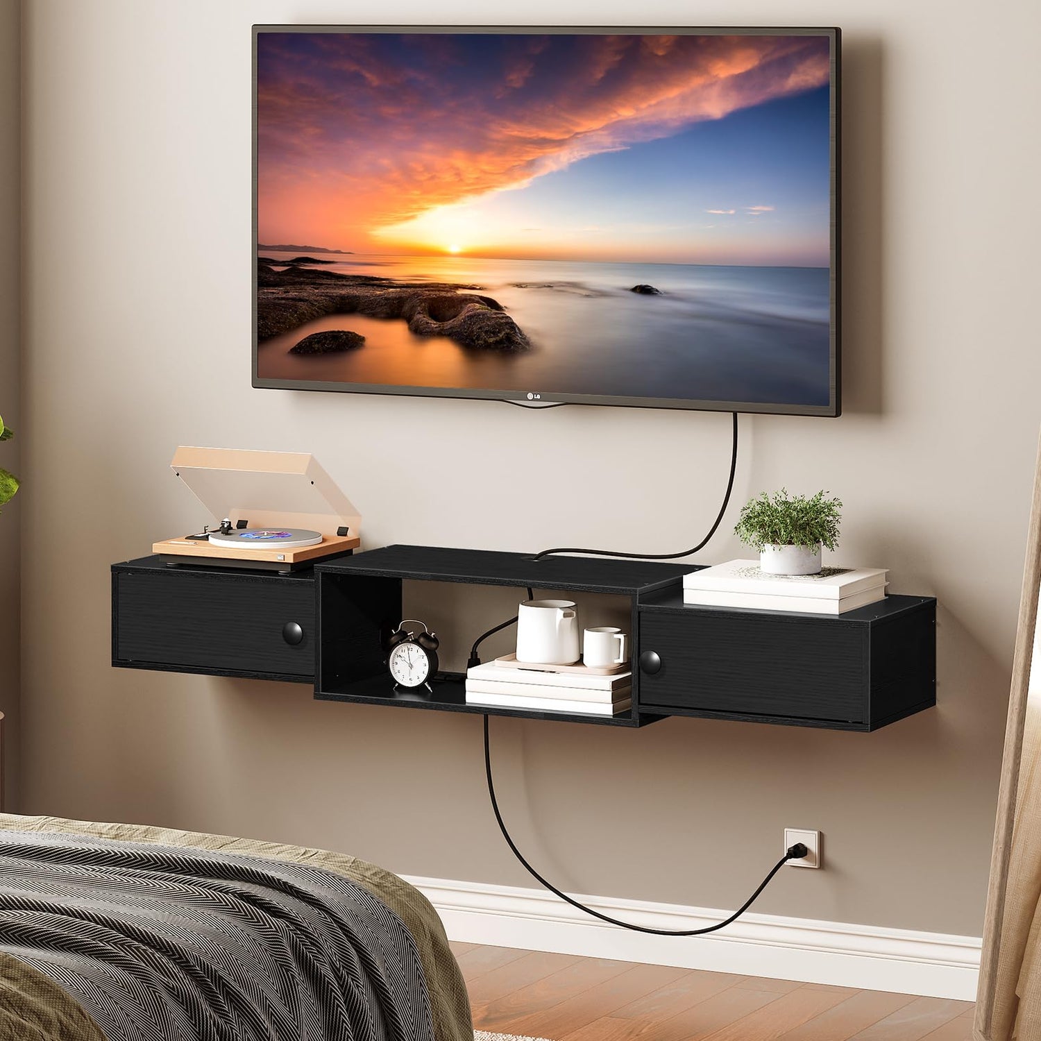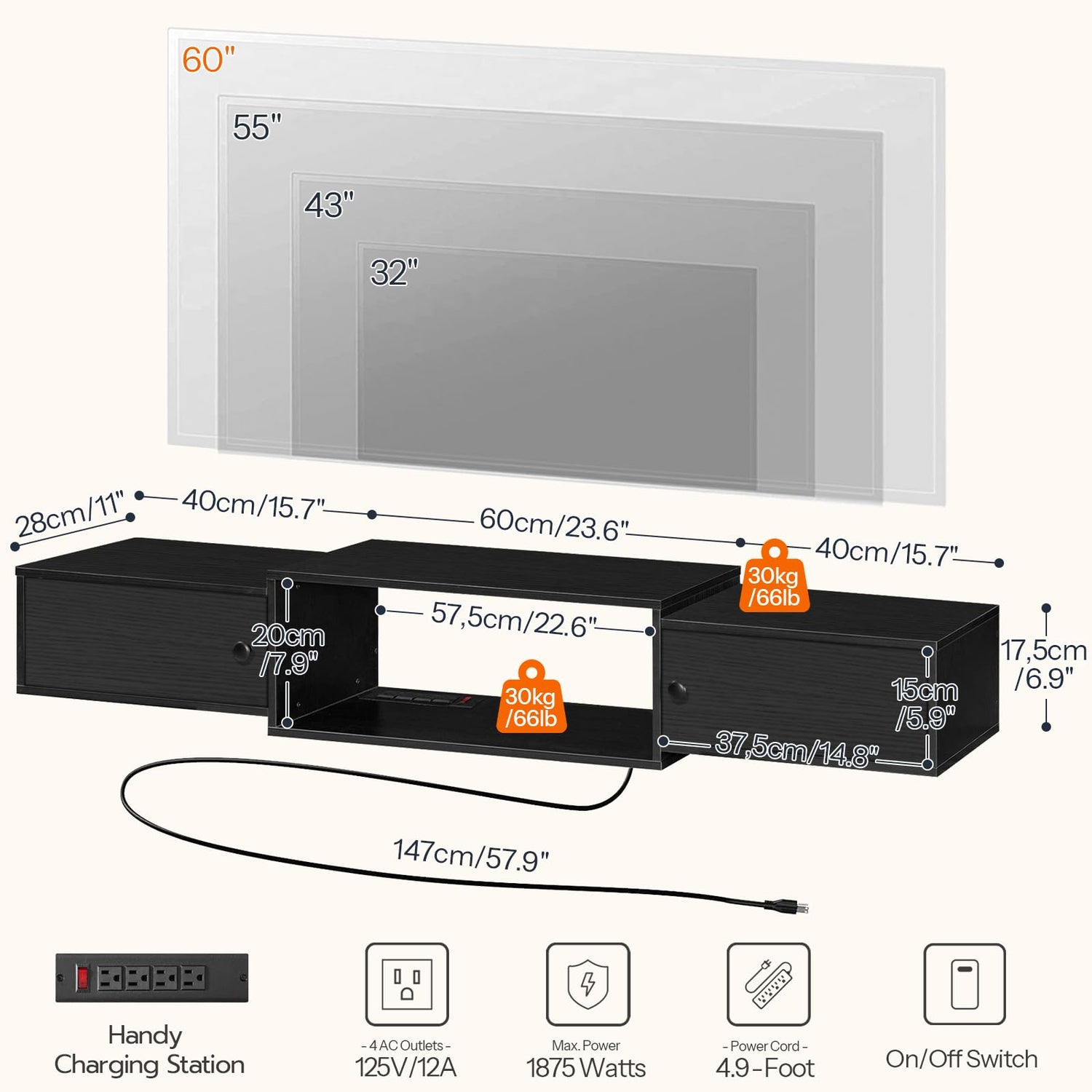 - Wall Mounted TV Stand with Power Outlets: With 4 standard plugs, the floating TV stand is extremely suitable for use with TVs, game consoles, WiFi router, DVDs, CD players, etc., easy charging for your media components