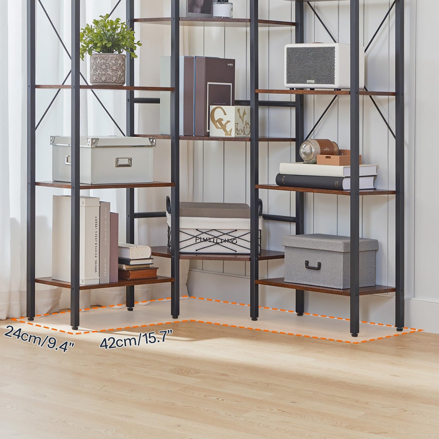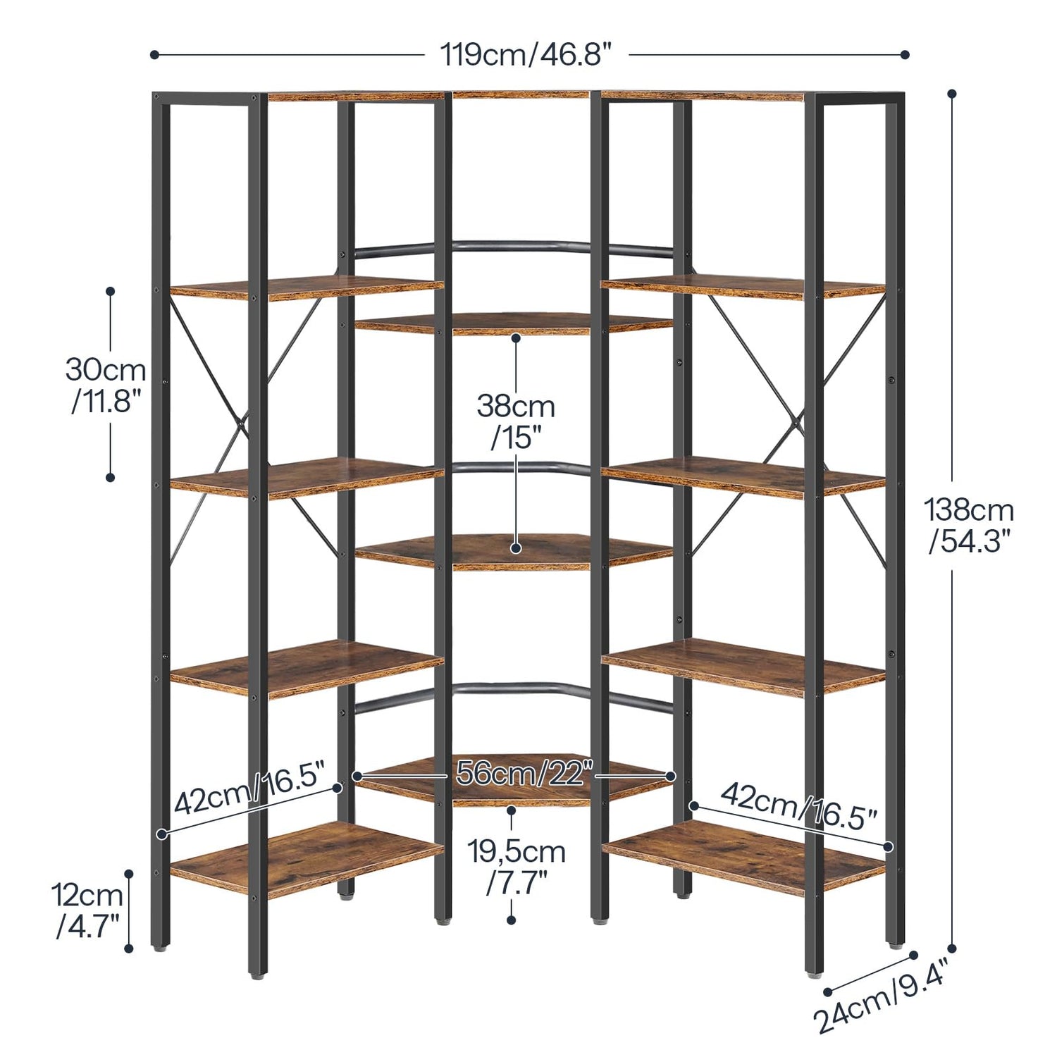 - Maximizing Corner Space: Measuring 46.8"L x 9.4"W x 54.3"H, the corner bookshelf is designed to fit perfectly into the corner of your home, making the most of space with smart storage solution. It keeps your home tidy and organized
