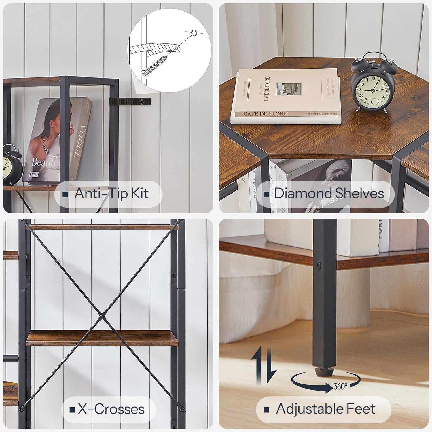 - Sturdy and Safe: Made of high-quality particleboard and a sturdy metal frame, the industrial bookcase is built to last. Each shelf holds up to 33 lbs. Adjustable feet and side X-crosses keep it stable, while the anti-tip kit adds extra safety