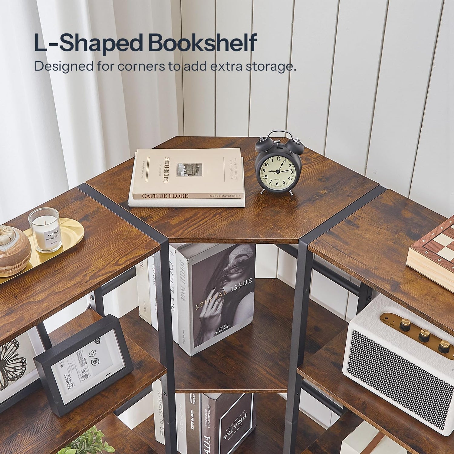 - Spacious Storage: The L-shaped bookshelf features 14 open storage shelves, with its beveled edge design, offers expansive storage capabilities. It can hold books, CDs, and decor, adding a unique touch to your living space
