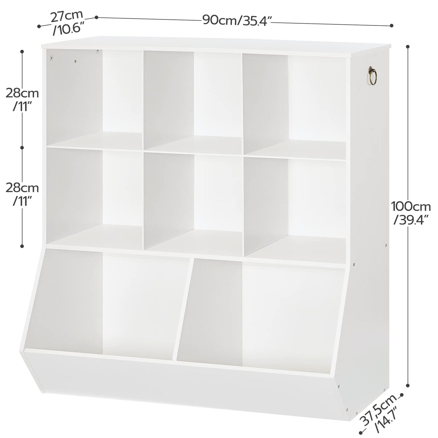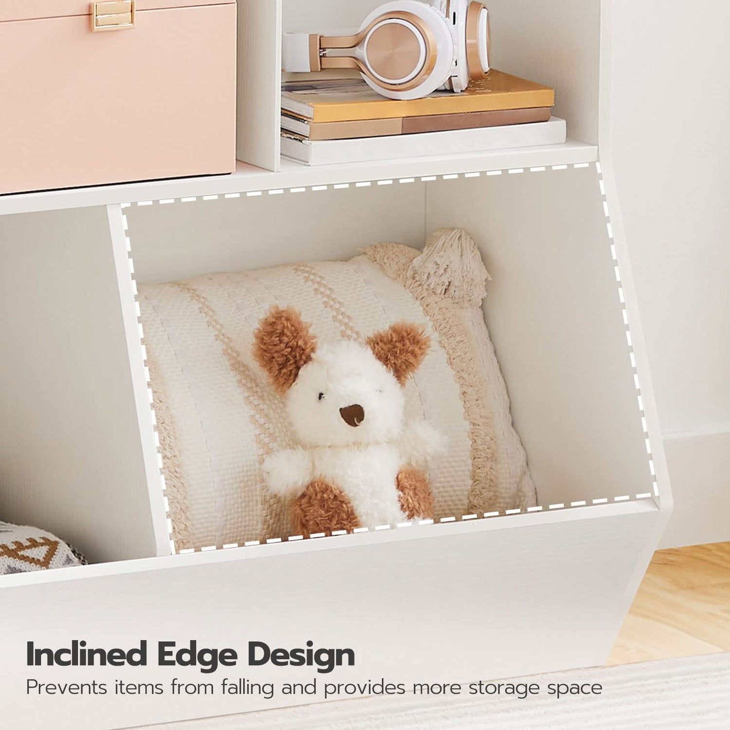 - Details Say the Facts: For kids’ consideration, details are never superfluous. This kids bookshelf is equipped with 2 side handles for easy move and decorative function. The design of bottom slanted edge guarantees better protection for stored items in the compartments and boards with rounded corners and smooth finish back the friendliness of this toy organizer
