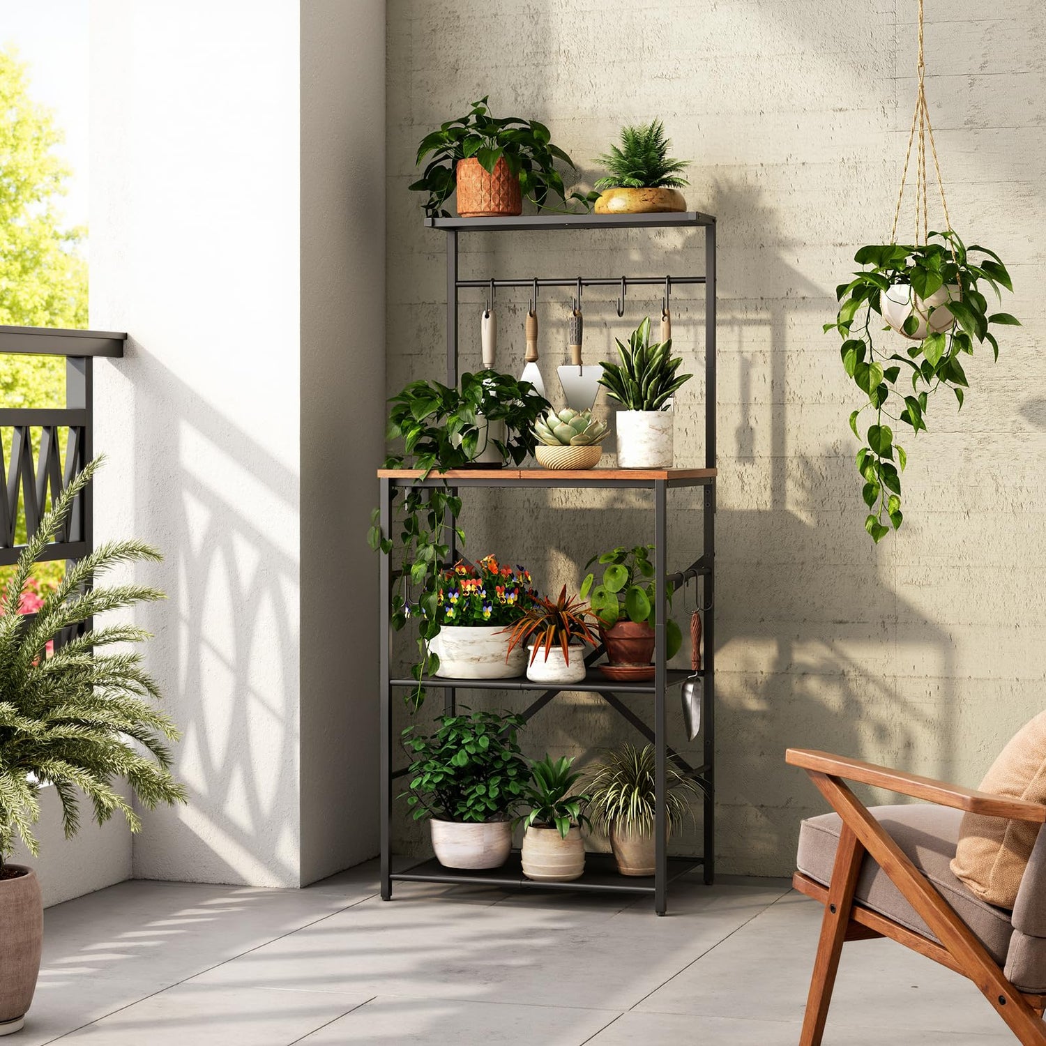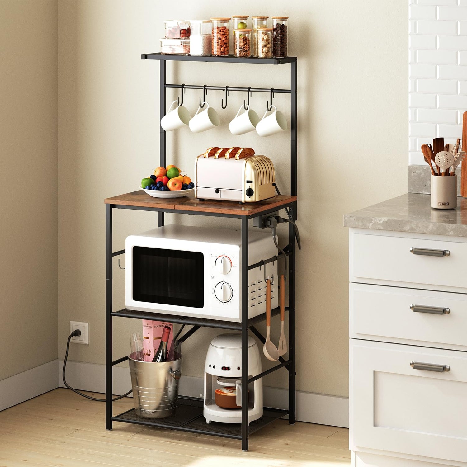 HOOBRO Kitchen Bakers Rack with Power Outlet, 4 Tiers Microwave Oven Stand with Storage, Coffee Bar Table with 9 S-shaped Hooks, Kitchen Storage Shelf Rack, Rustic Brown and Black BF58UHB01