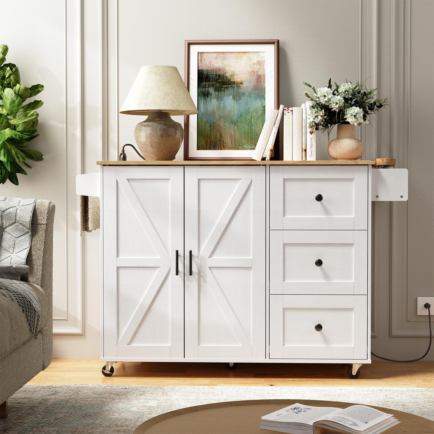 HOOBRO Kitchen Island with Power Outlet, Kitchen Island on Wheels, Rolling Kitchen Island Cart with 3 Drawers, Storage Cabinet and Adjustable Shelf, for Home and Kitchen, White and Natural WN15UZD01
