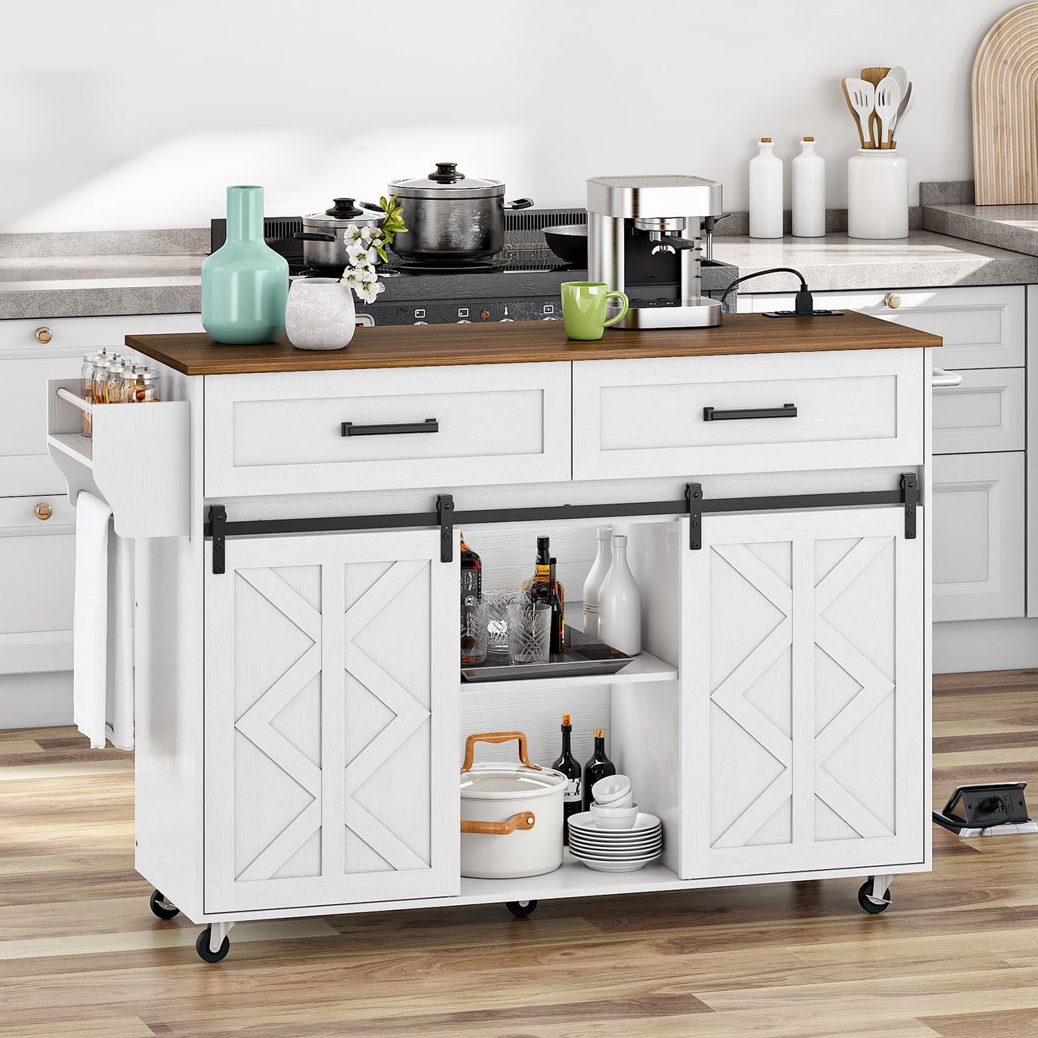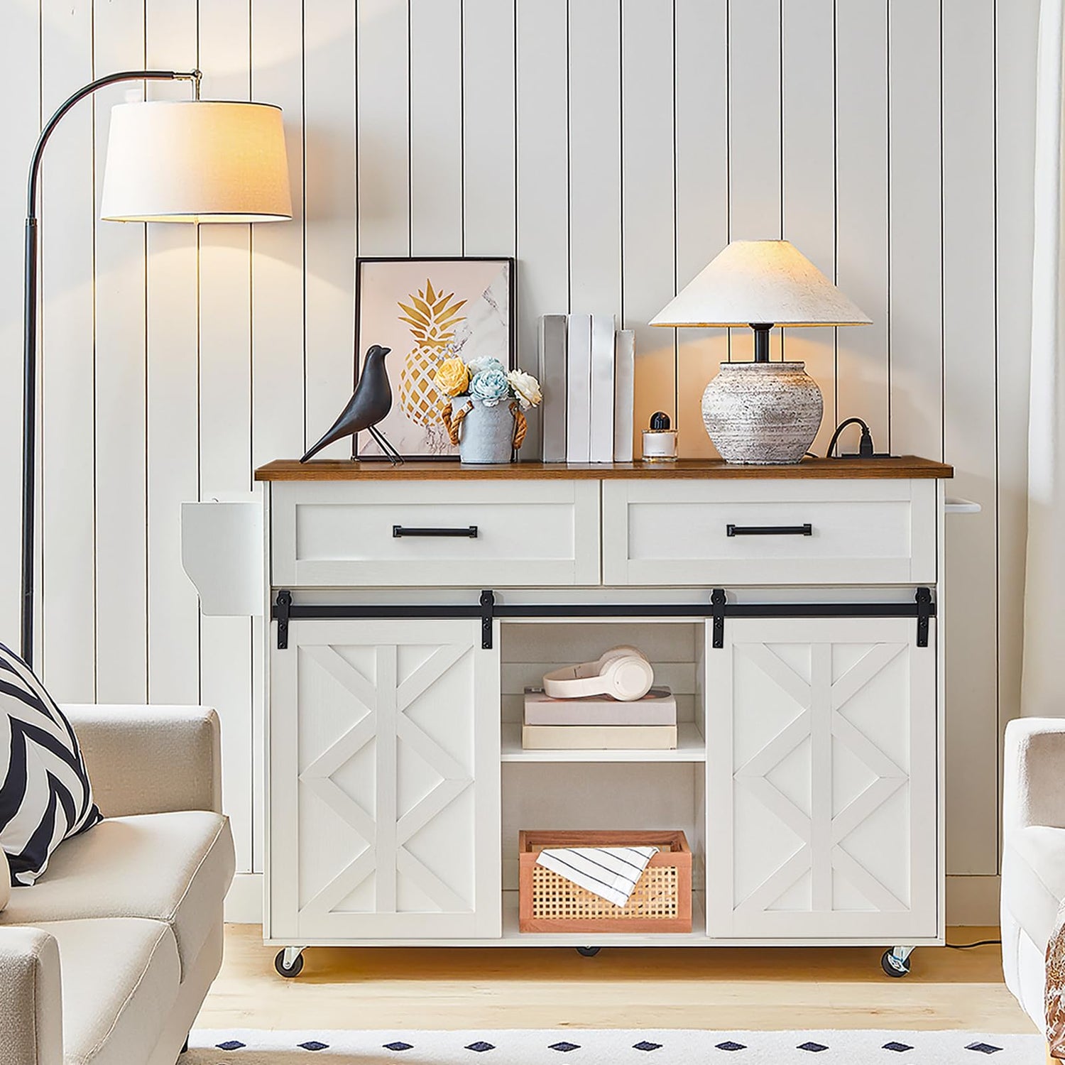 HOOBRO Kitchen Island with Storage, Power Outlet, Rolling Kitchen Island Cart on Wheels, with 2 Drawers, Sliding Barn Doors and Lockable Wheels, Farmhouse, White and Walnut WH28UZD01
