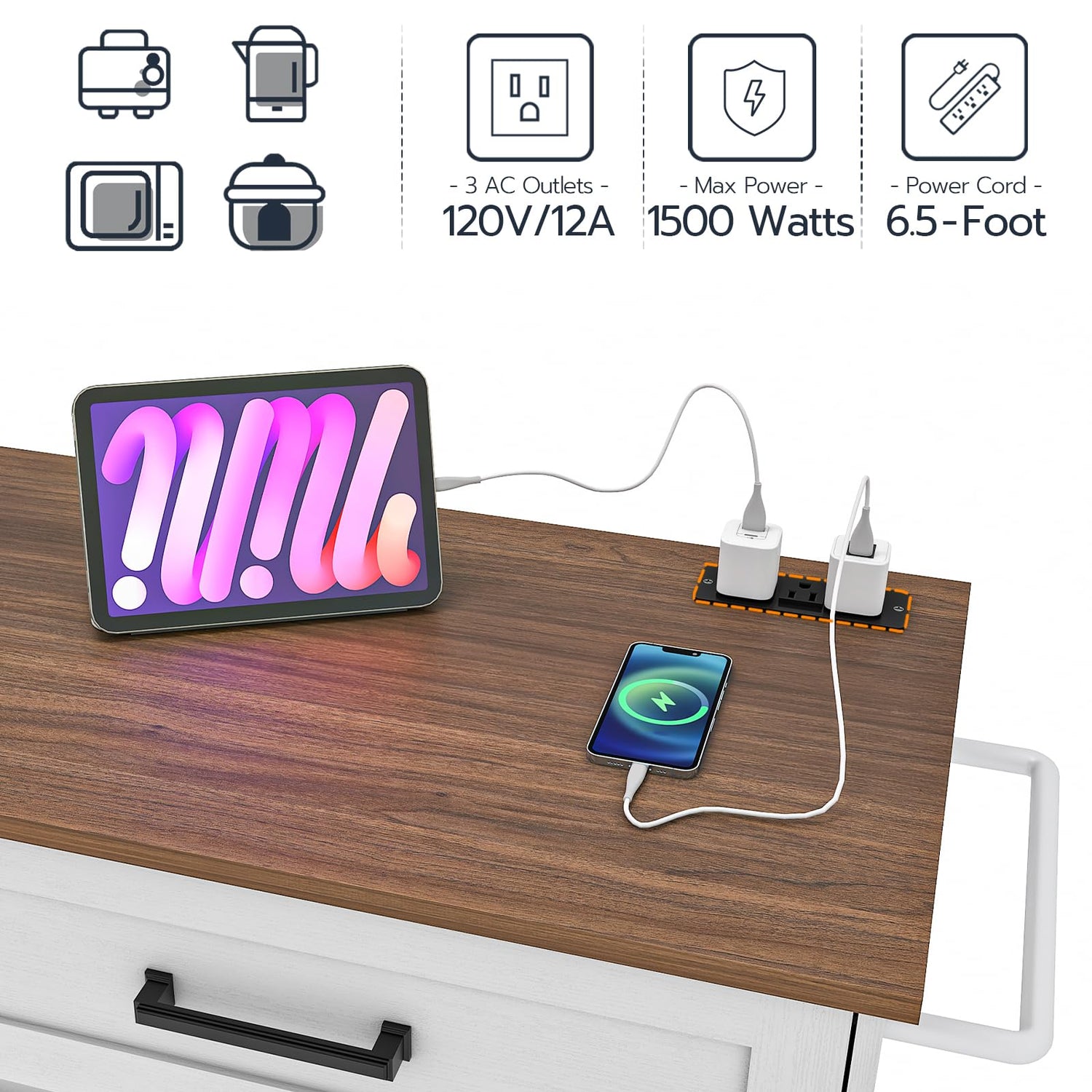 - Kitchen Island with Power Outlet: The kitchen island cart with charging station incorporates a handy socket with 3 AC outlets and a 6.5-foot long power cord, facilitating electrical access during cooking. No power shortages here, boosting your kitchen productivity