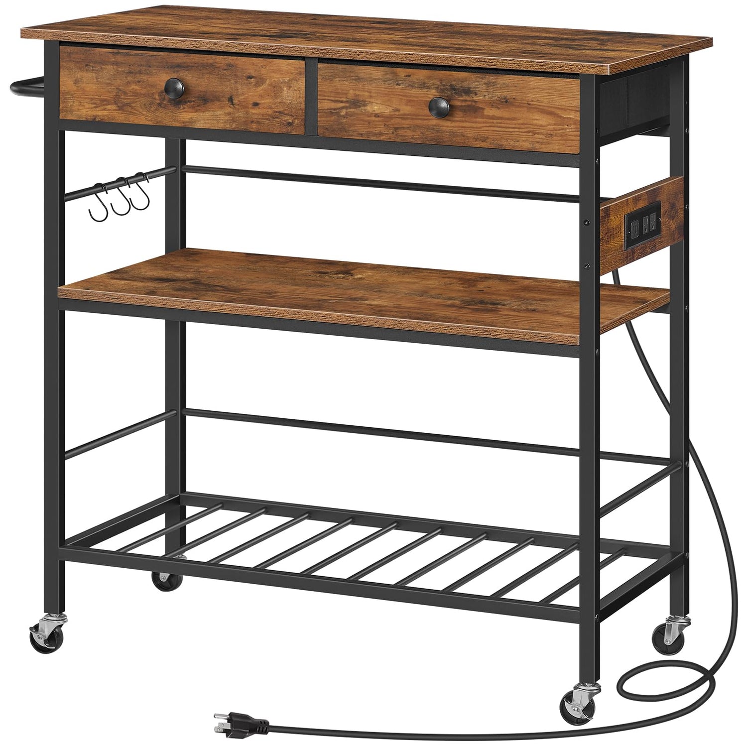 HOOBRO Kitchen Island with Storage, Rolling Island Cart for Kitchen with 2 Drawers & Outlet, 3 Tier Coffee Station and Microwave Stand, Kitchen Island Table for Home, Rustic Brown and Black BF08UZD01
