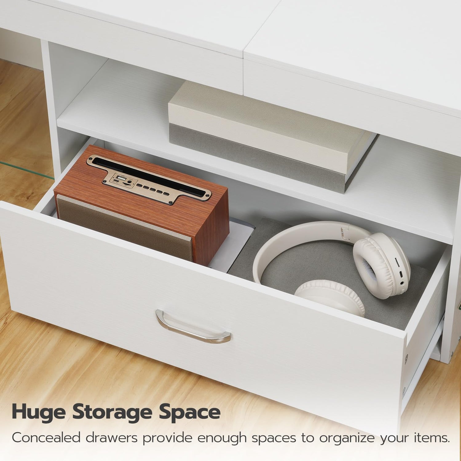 HOOBRO LED TV Stand with Power Outlets to 65 inch TV, Gaming Entertainment Center with Glass Shelves and Large Drawer, Modern Media TV Console Table for Living Room Bedroom, White WT14UDDS01