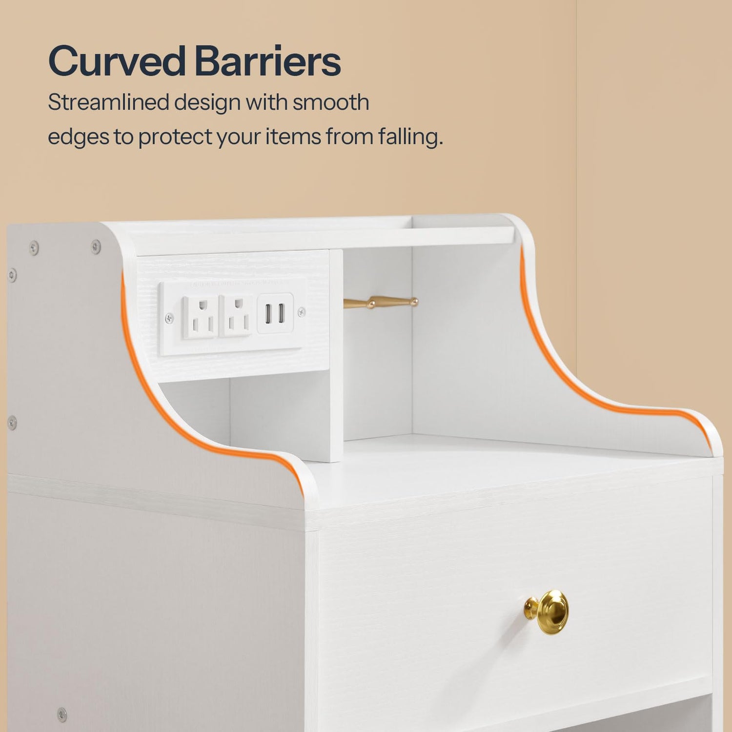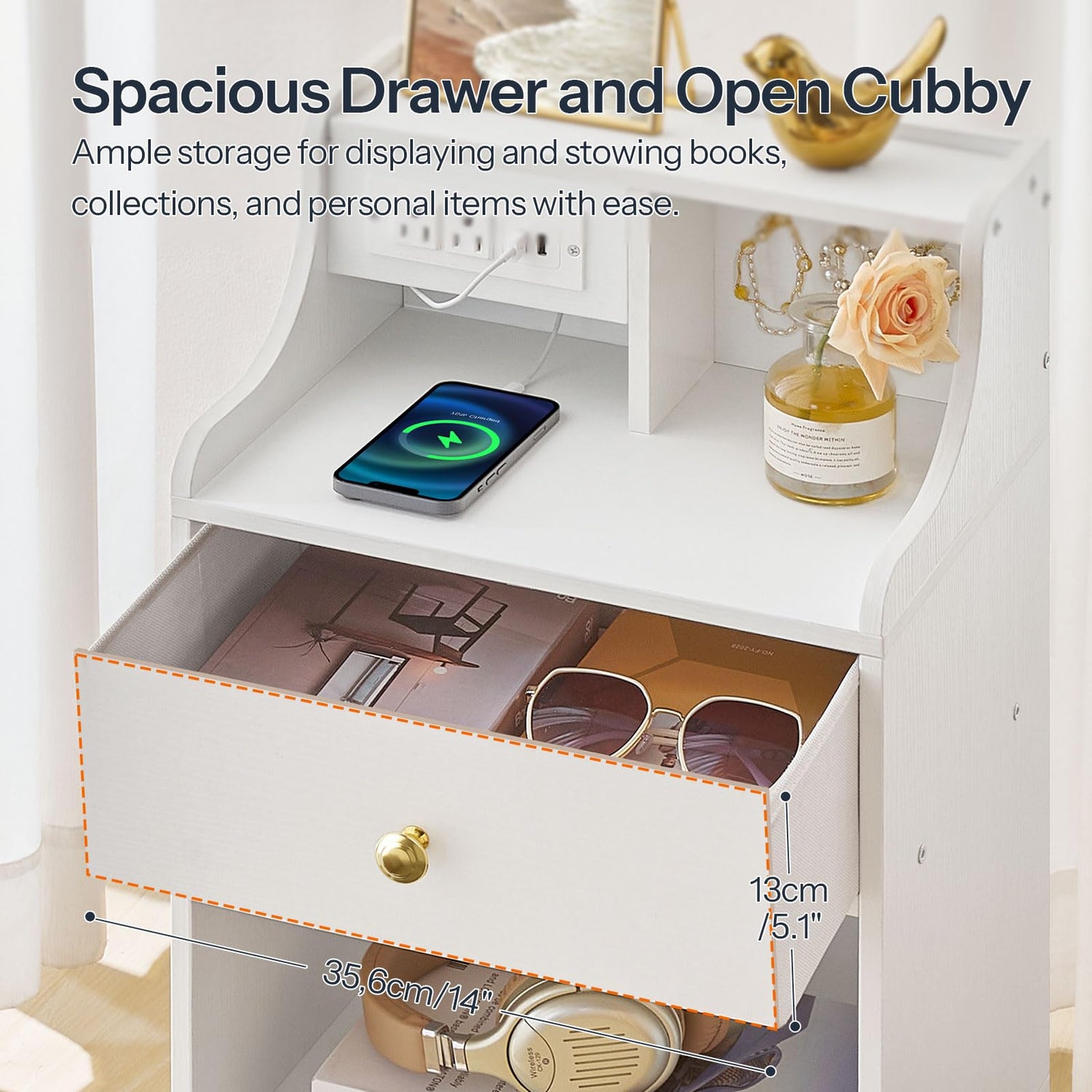HOOBRO Nightstand with Charging Station and LED Light, Bedside Table with Fabric Drawer, End Table with USB Ports & Outlets, Modern Side Table, Sofa Table for Bedroom, White WT188UDBZ01