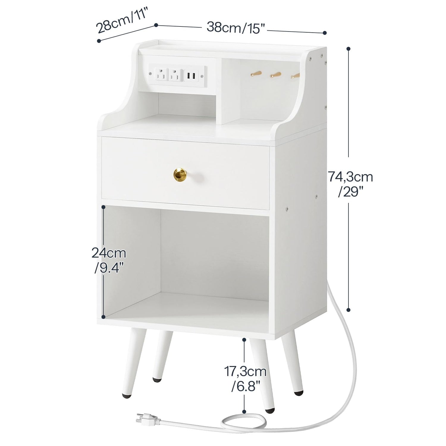 - End Table With Versatile Storage: Open cubby is great for books and magazines. A non-woven fabric drawer hides clutter. The top shelf of the modern nightstand stows small items. 3 jewelry pegs provide a handy spot for your jewelry before bedtime. The side table keeps your space organized and versatile