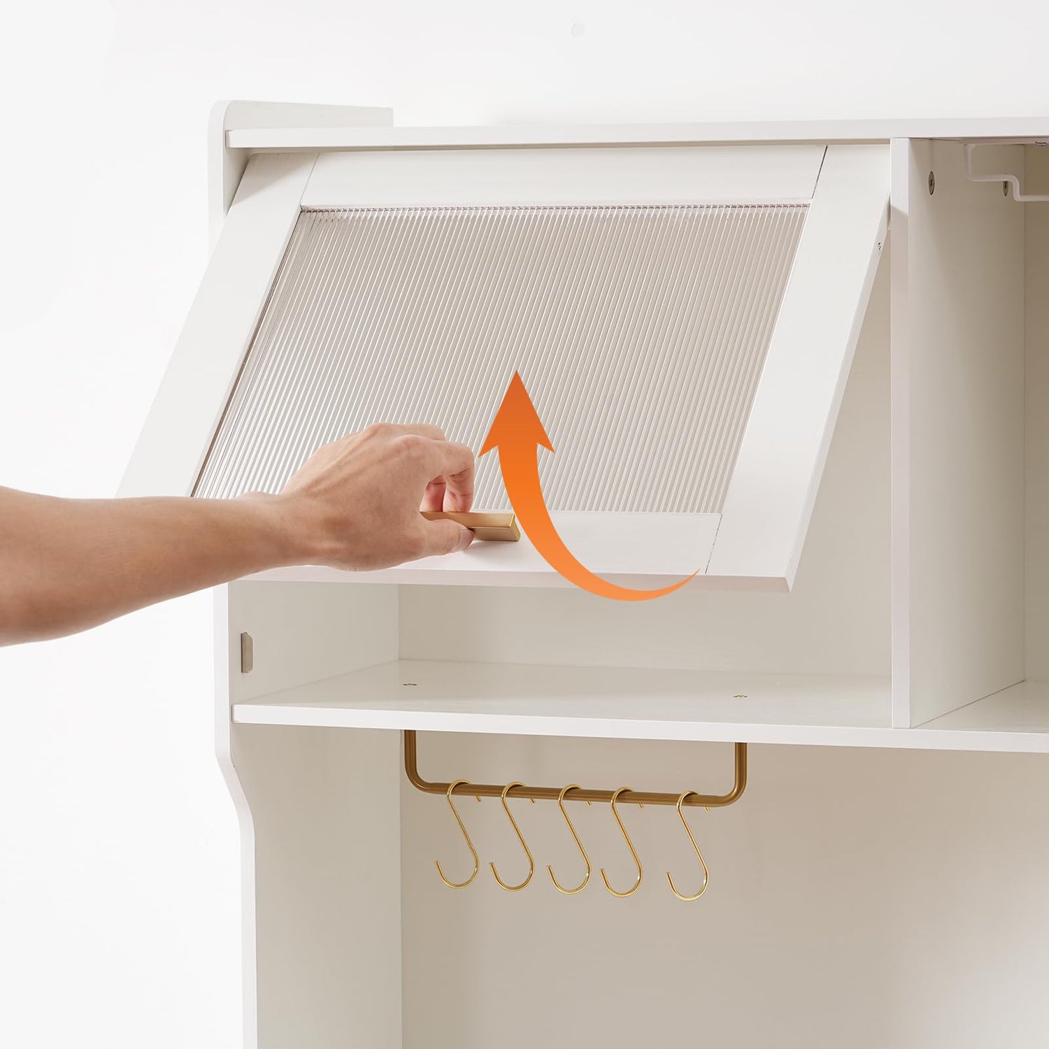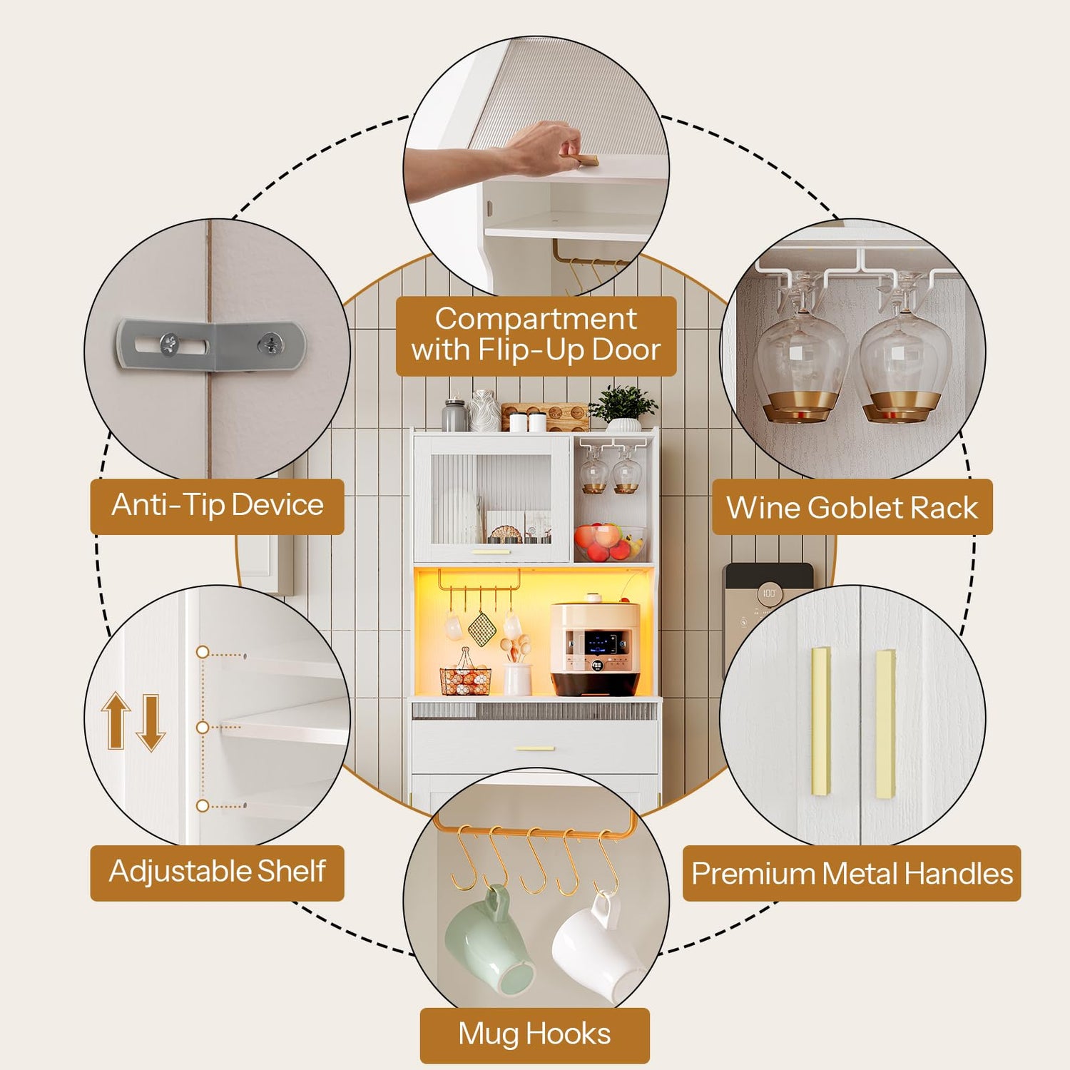 - Modern Aesthetic: Sleek and functional, this kitchen pantry storage cabinet's white finish and acrylic drawer front add a stylish touch to your home. Wine glass holders and mug hooks keep everything in place, transforming your kitchen into a chic, organized space