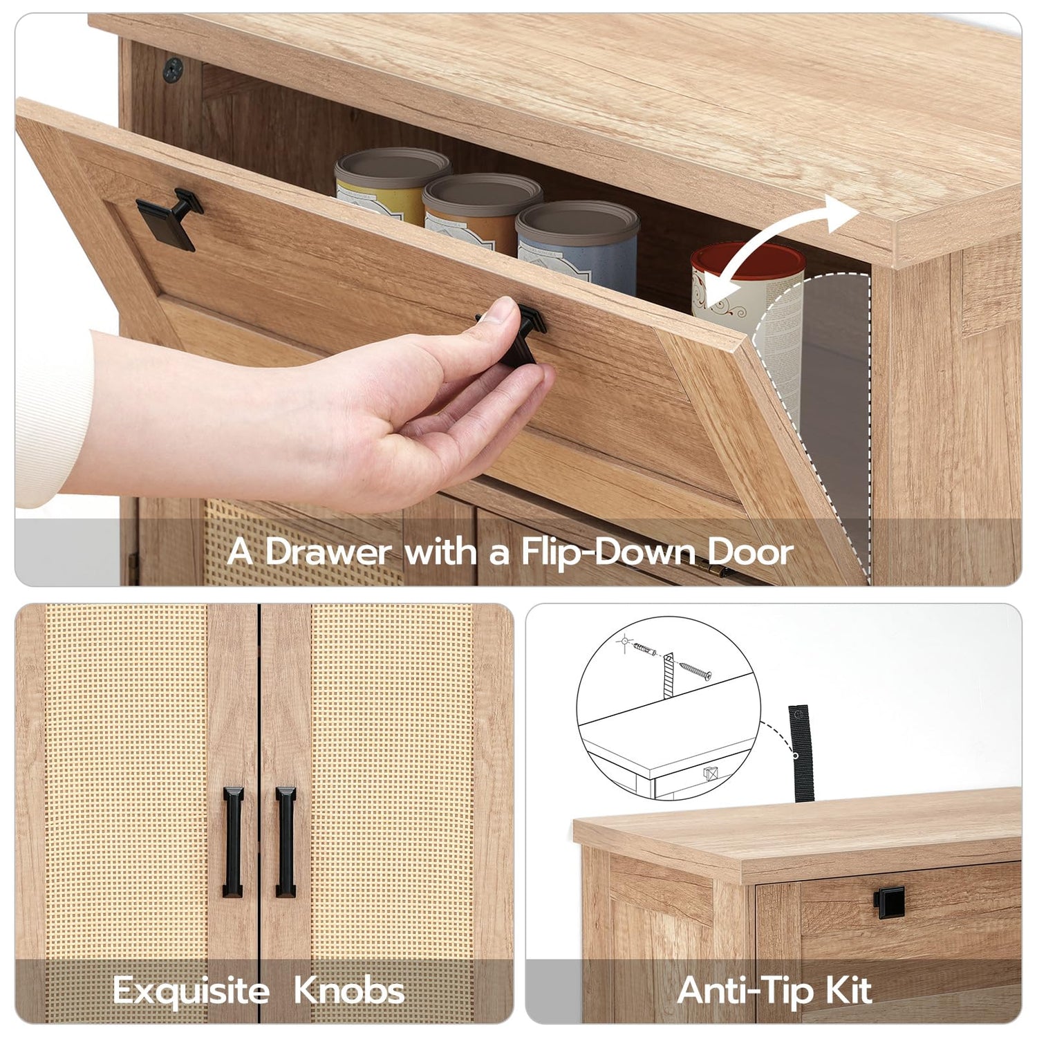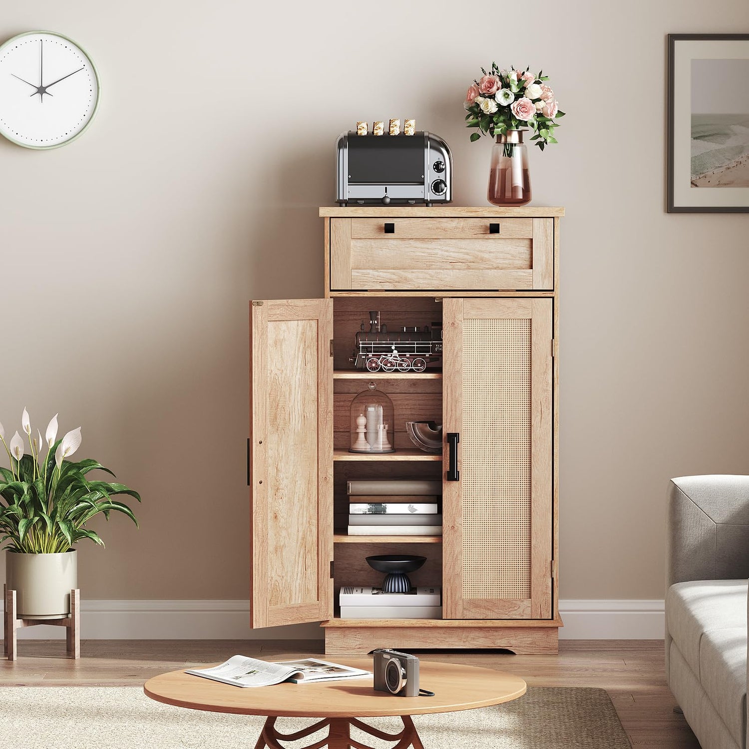 HOOBRO Pantry Cabinet, Kitchen Pantry Cabinet with Rattan-Like Decoration,Storage Cabinet with Drawer and Adjustable Shelf, Farmhouse Style Kitchen Pantry for Kitchen, Dining Room, Natural NL12PC01