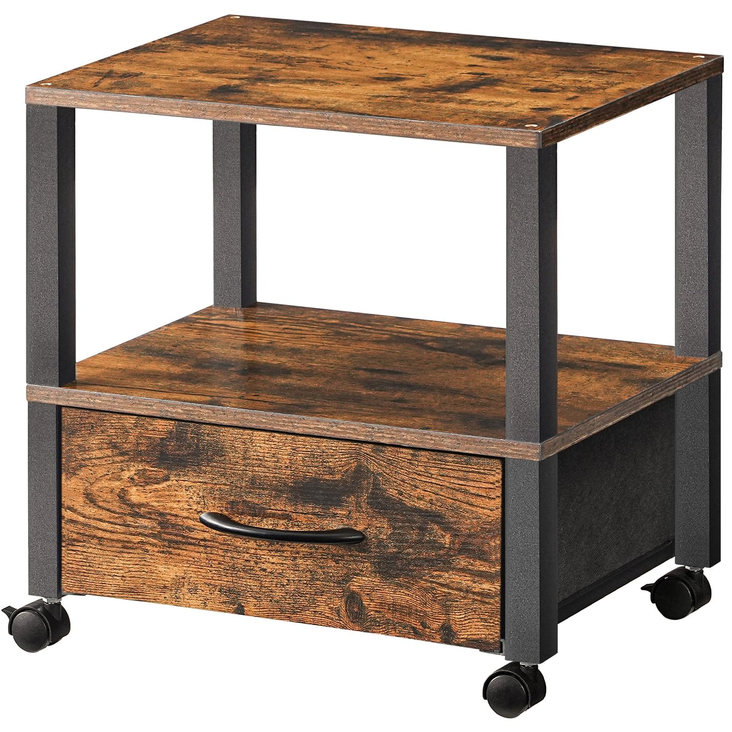 HOOBRO Printer Stand, Printer Stand with Storage, Under Desk Printer Table, Printer Cart with Drawer and Shelves, Rolling Small Printer Stand on Wheels, for Office, Rustic Brown and Black BF39PS01