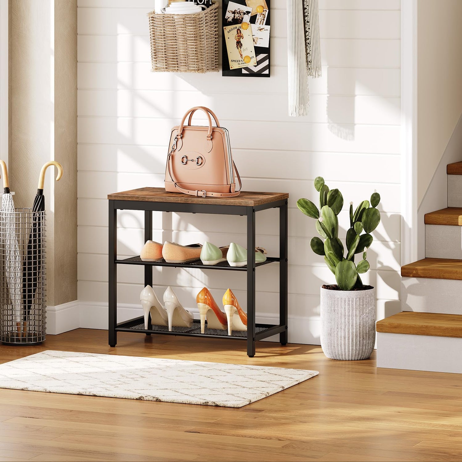 - Versatility: Combining the functions of a shoe rack and stool, this shoe bench allows for the convenient shoe changing in entryway with a top bearing up to 300 lb. Two mesh shelves keep your entryway tidy and free of scattered shoes