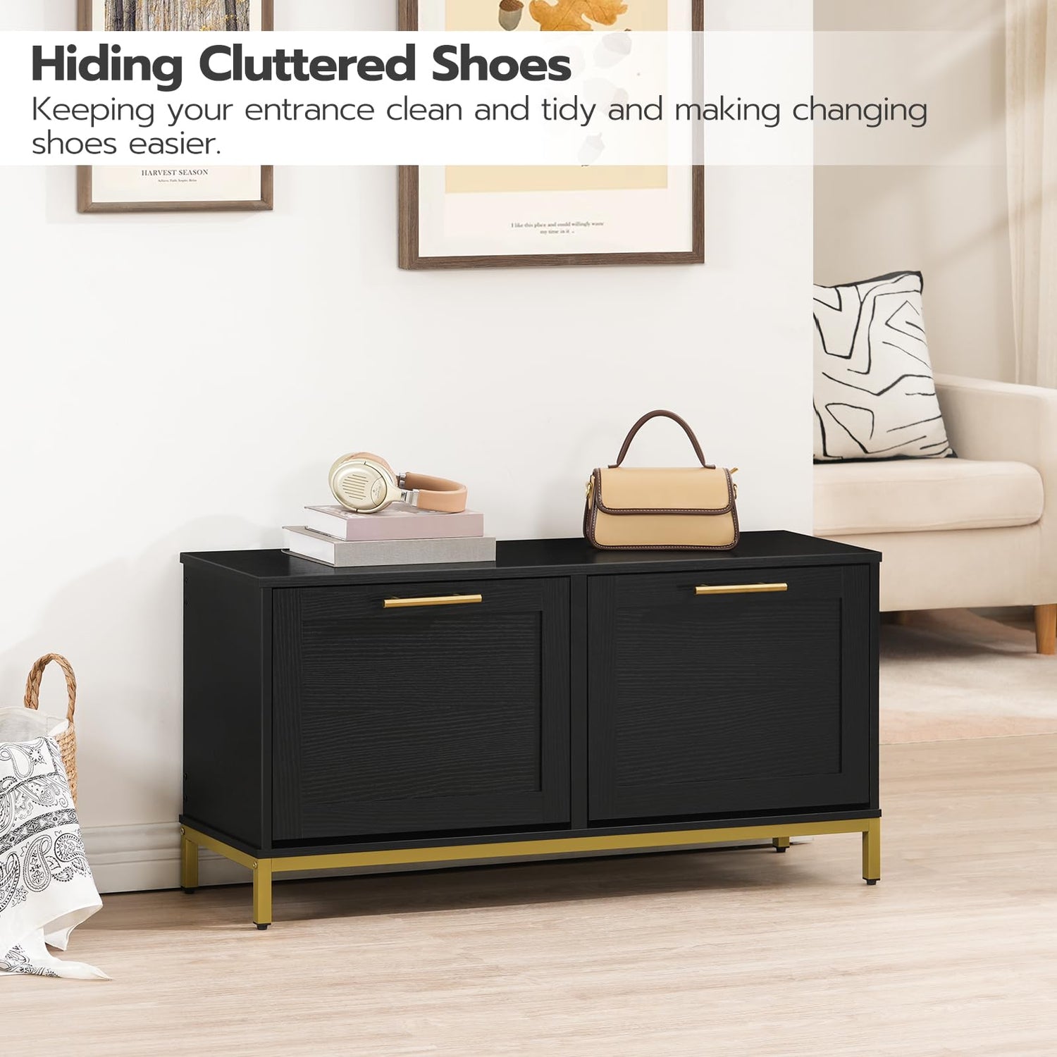 HOOBRO Shoe Bench with Storage, Shoe Storage Bench with 2 Flip Drawers, 39.4" Shoe Cabinet with Bench, Hidden Shoe Rack Organizer for Entryway, Foyer, Hallway, Mudroom, Black and Gold DB48HX01