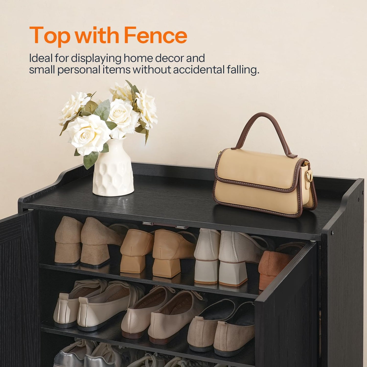 - Elegant Design and Stylish Color Palette: The narrow shoe cabinet's top fence and groove-patterned door design look beautiful and add a touch of fashion. The collision of classic black and luxurious gold makes it a stunning addition to your home