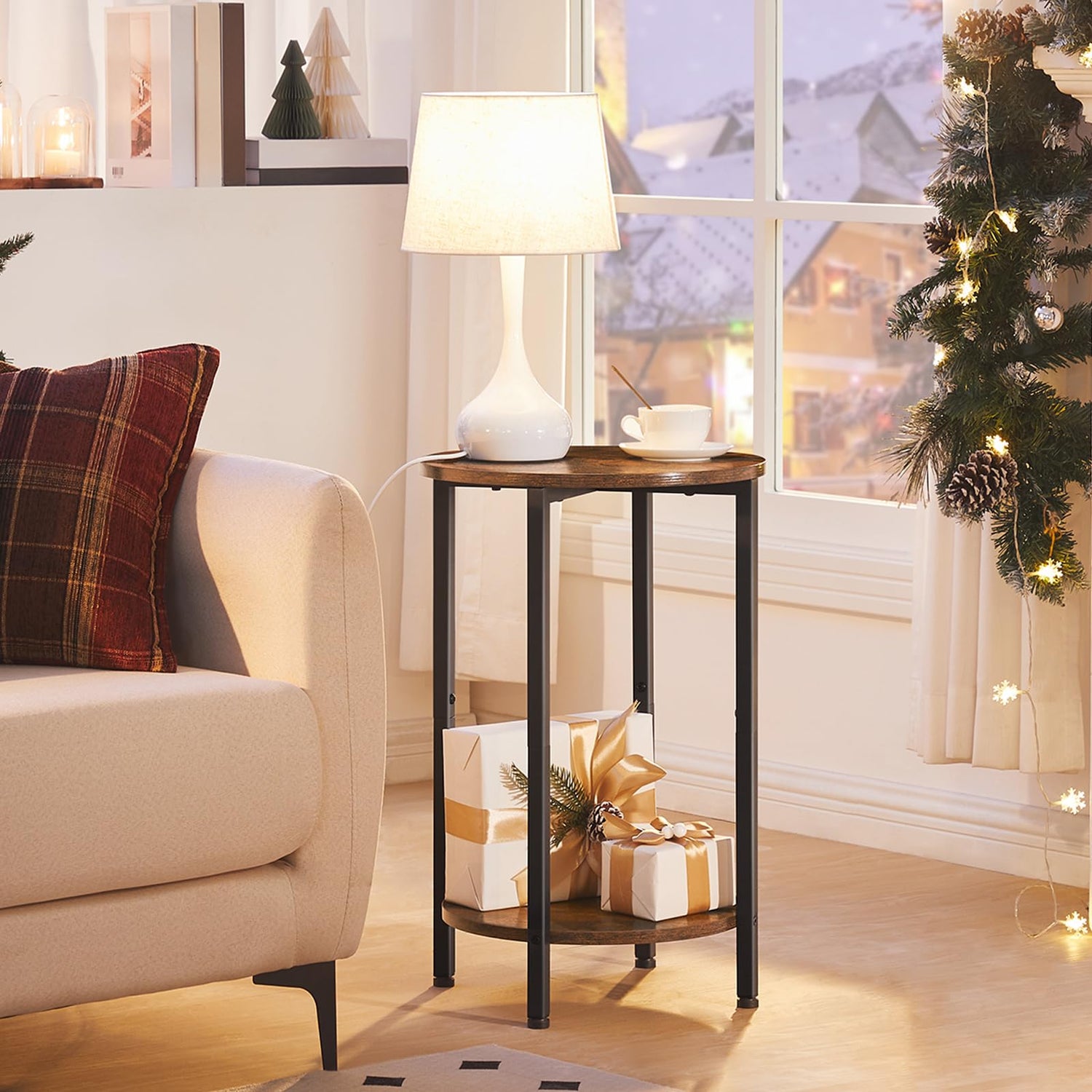 HOOBRO Side Table, Round Sofa Couch Table with Storage Shelf, 2-Tier Industrial End Table, Stable Metal Frame, Wooden Look Accent Table for Small Spaces, Living Room, Bedroom, Rustic Brown BF58BZ01G1