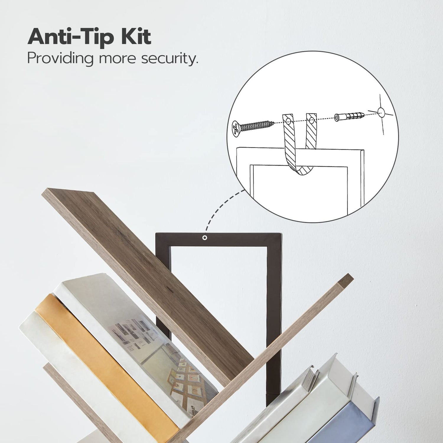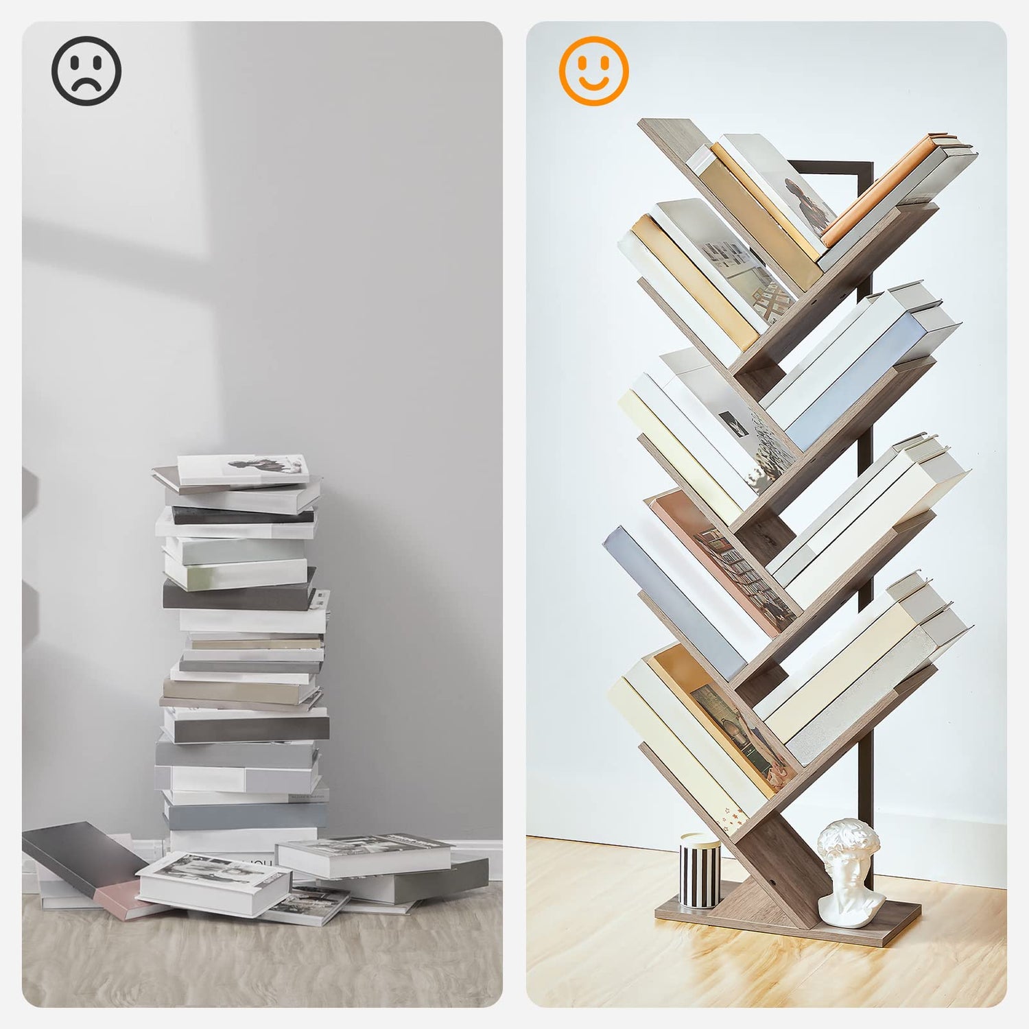 - Stable Structure: The tree bookshelf is made from high-quality particle board and metal frame, which is sturdy and enduring. Equipped with the anti-toppling device, no matter where the book tree bookshelf sits, it can stand safely without worrying about tipping over