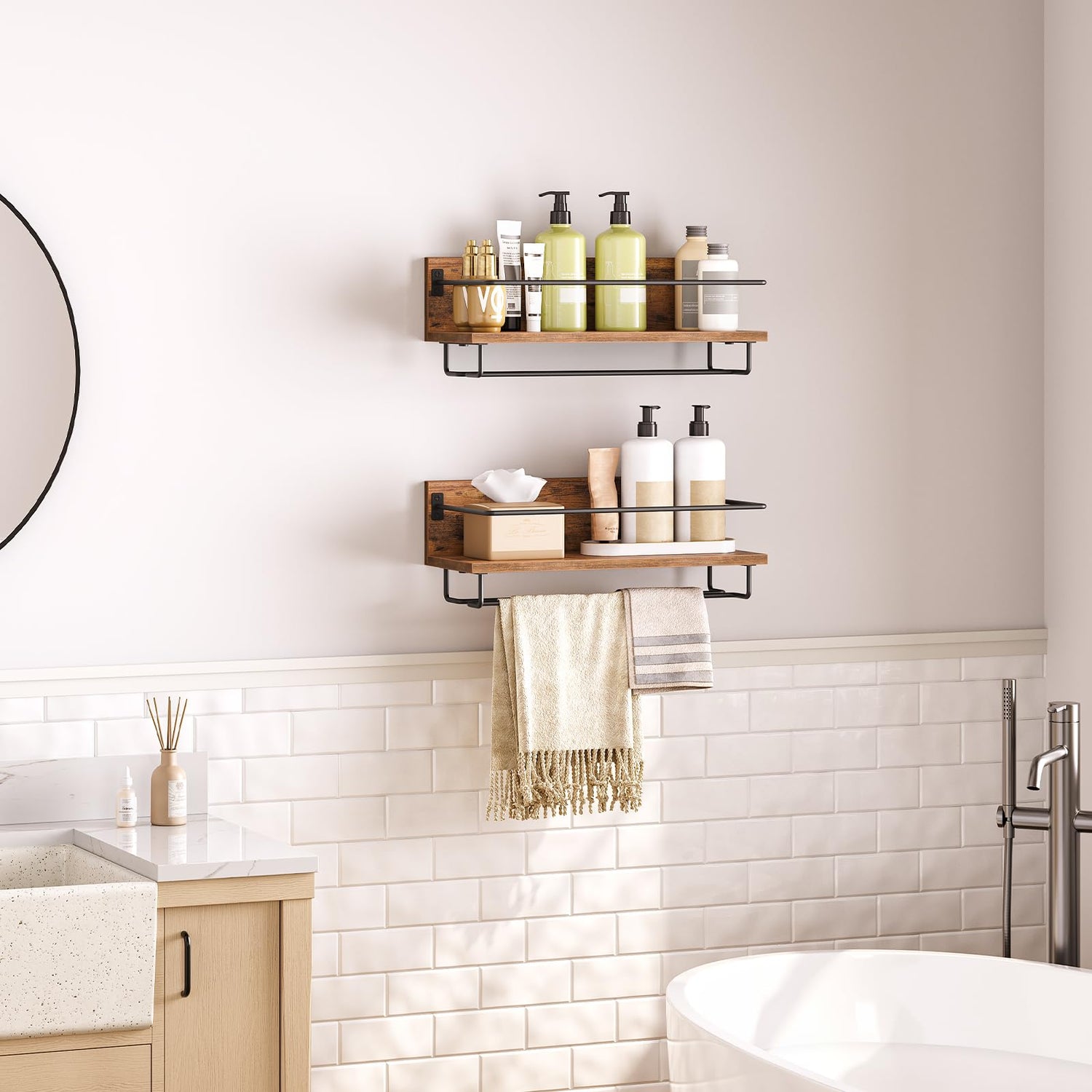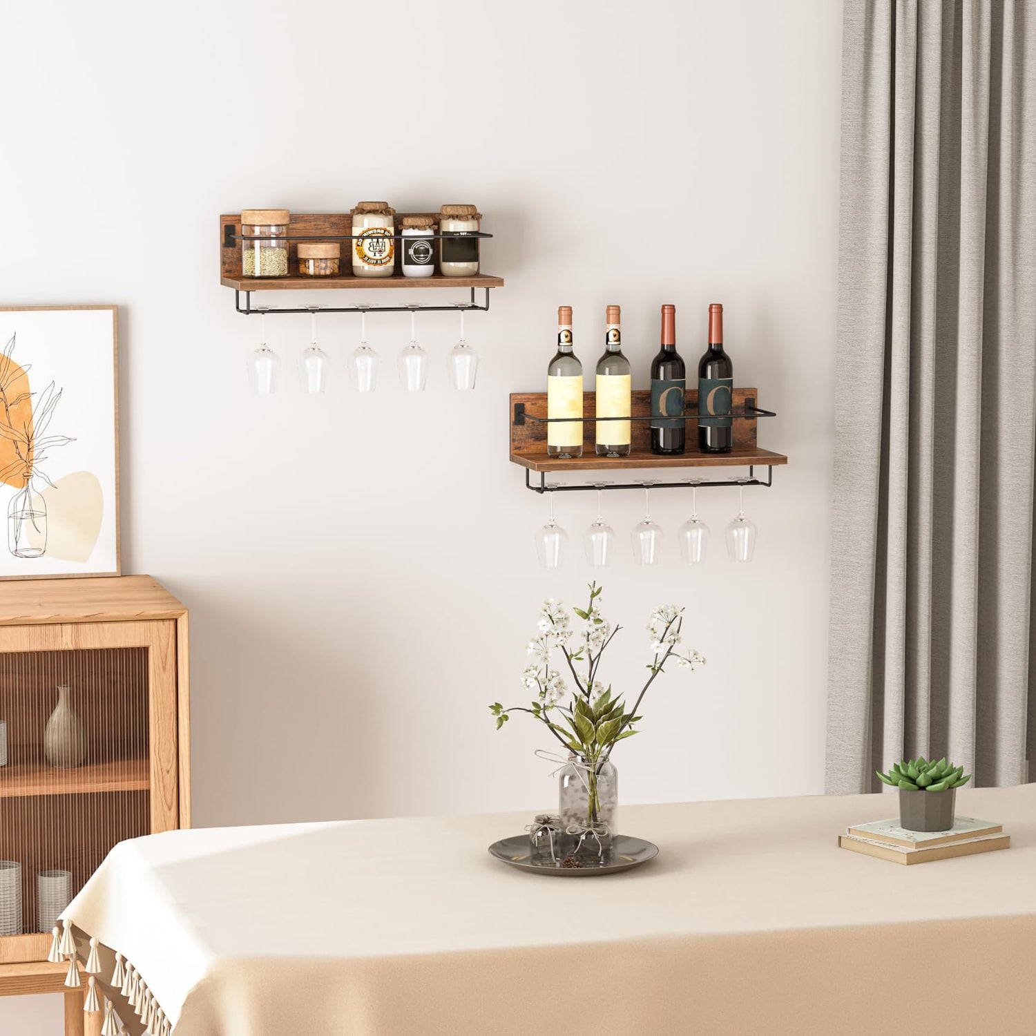HOOBRO Wall Mounted Wine Rack 2 Pack, Wine Shelf Hanging Floating Wall Shelves, Wine Glass Bottle Rack Stemware Holder, for Living Room, Dining Room, Kitchen, Rustic Brown and Black BF28BJ01
