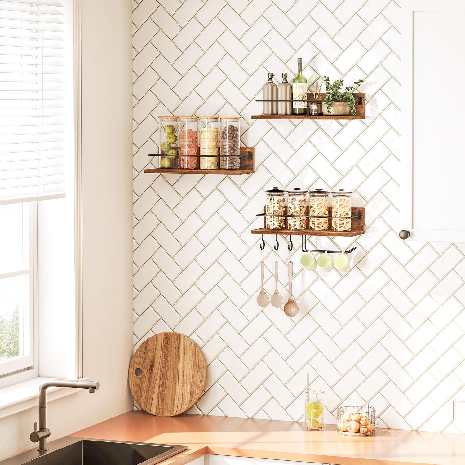 - Guardrails Included: These floating wine shelves capture your heart with their attention to detail. Each hanging wine shelf has an L-shaped structure with the metal fence, effectively preventing accidental falls and ensuring secure placement when you access items