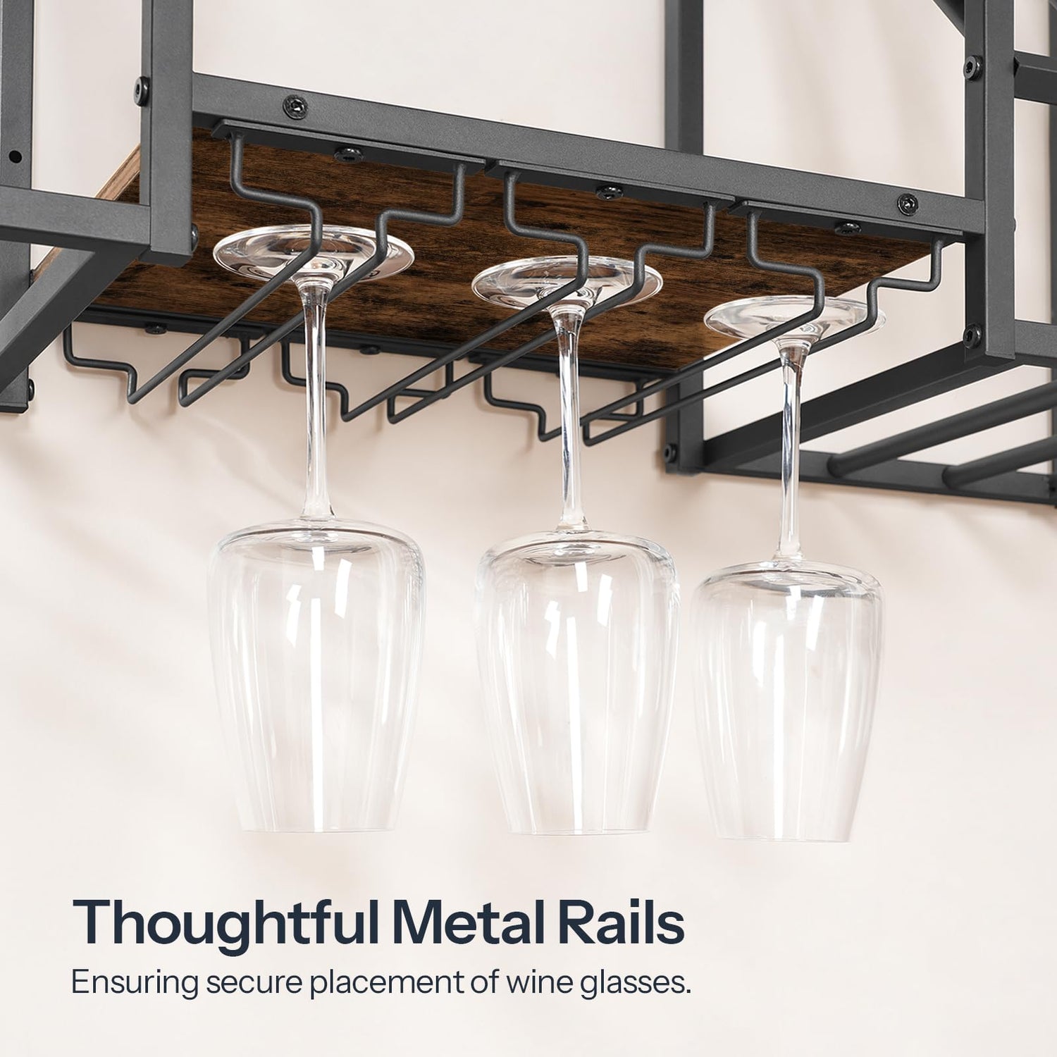 HOOBRO Wall Mounted Wine Rack, 3-Tier Wall Wine Rack, Floating Shelf with Wine Glass and Bottle Holders, Display Storage Shelf, for Dining Room, Kitchen, Living Room, Rustic Brown and Black BF23BJ01