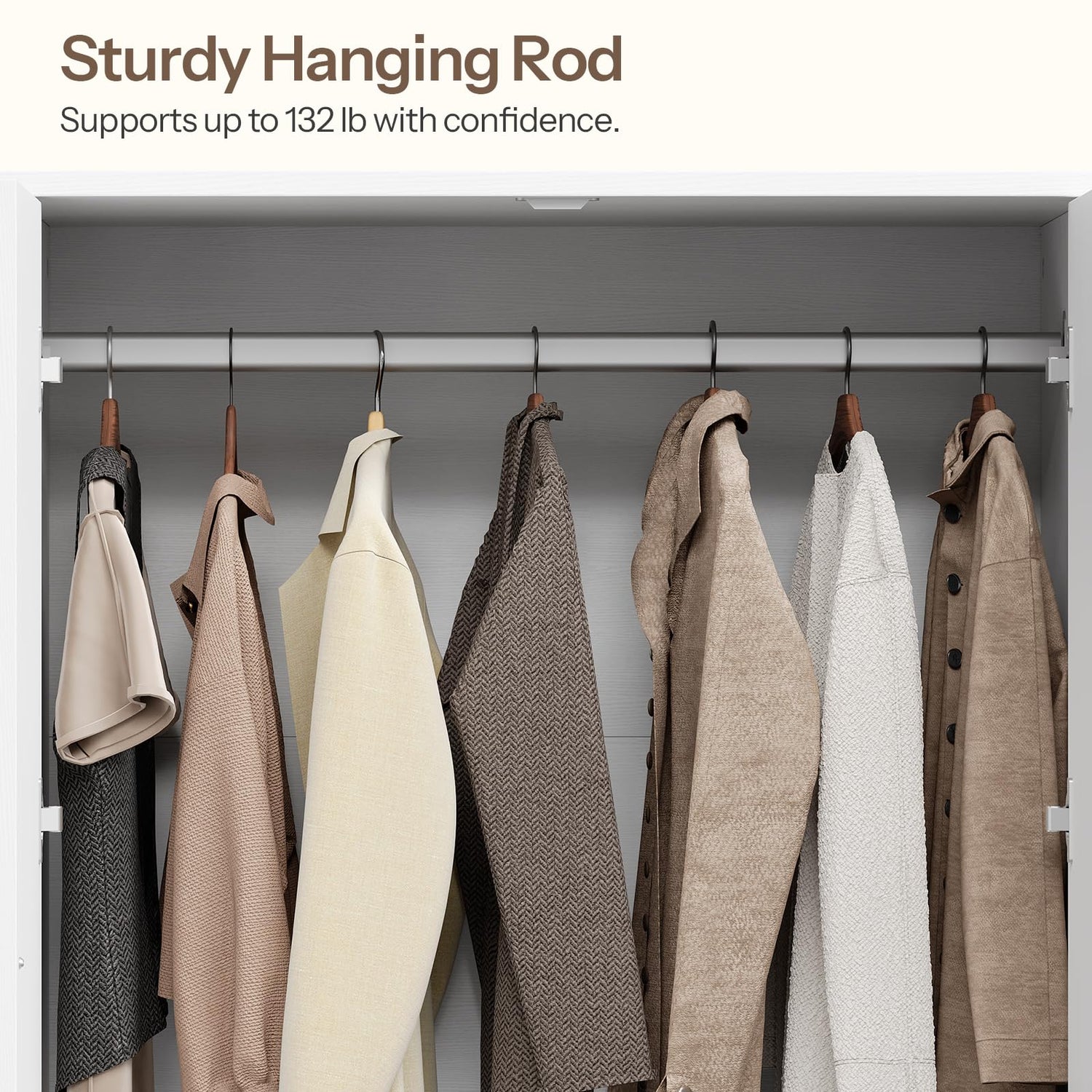 - Robust Build and Load Capacity: Constructed from high-grade MDF and particleboard, the wardrobe ensures durability. Each open shelf holds up to 44 lb, the hanging rod 132 lb, and each drawer 44 lb. Metal components are easy to use and built to last