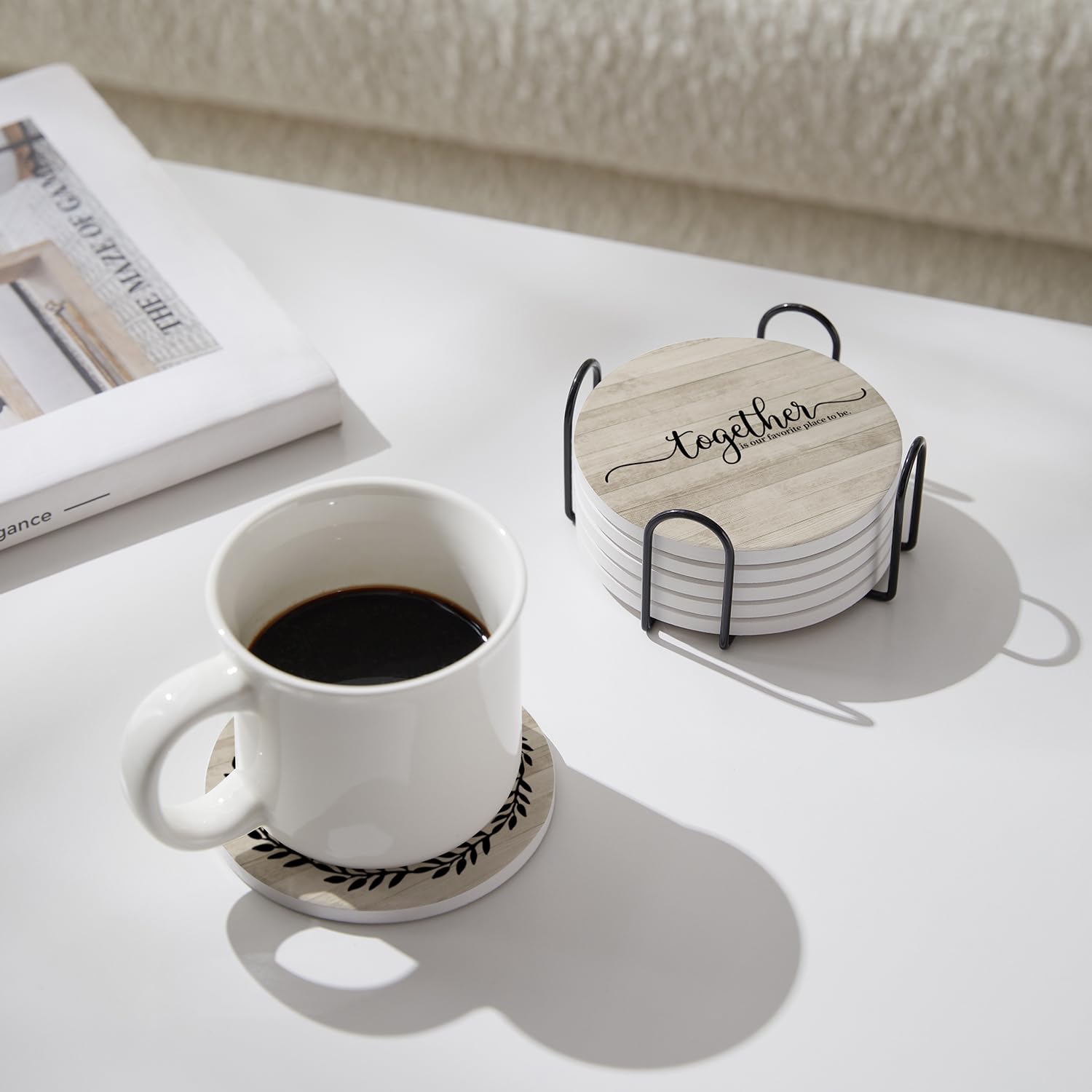 Hoomey Coasters for Drinks, Set of 6 Absorbent Drink Coasters with Holder, Farmhouse Style Ceramic Drink Coasters with Cork Backing for Table Protection, Housewarming Gifts for New Home