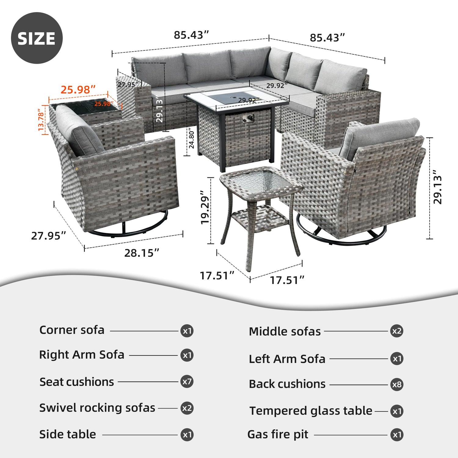 - Sectional Design: Comes with 1 firepit table,2 swivel rocker,2 single arm chairs, 2 middle chairs, 1 corner chair 1 double layer side table and 1 tempered glass top coffee table. With chair connecting clips to lock the chairs together if need be. Modular design enables to make the patio set in any shape you like to fit your needs