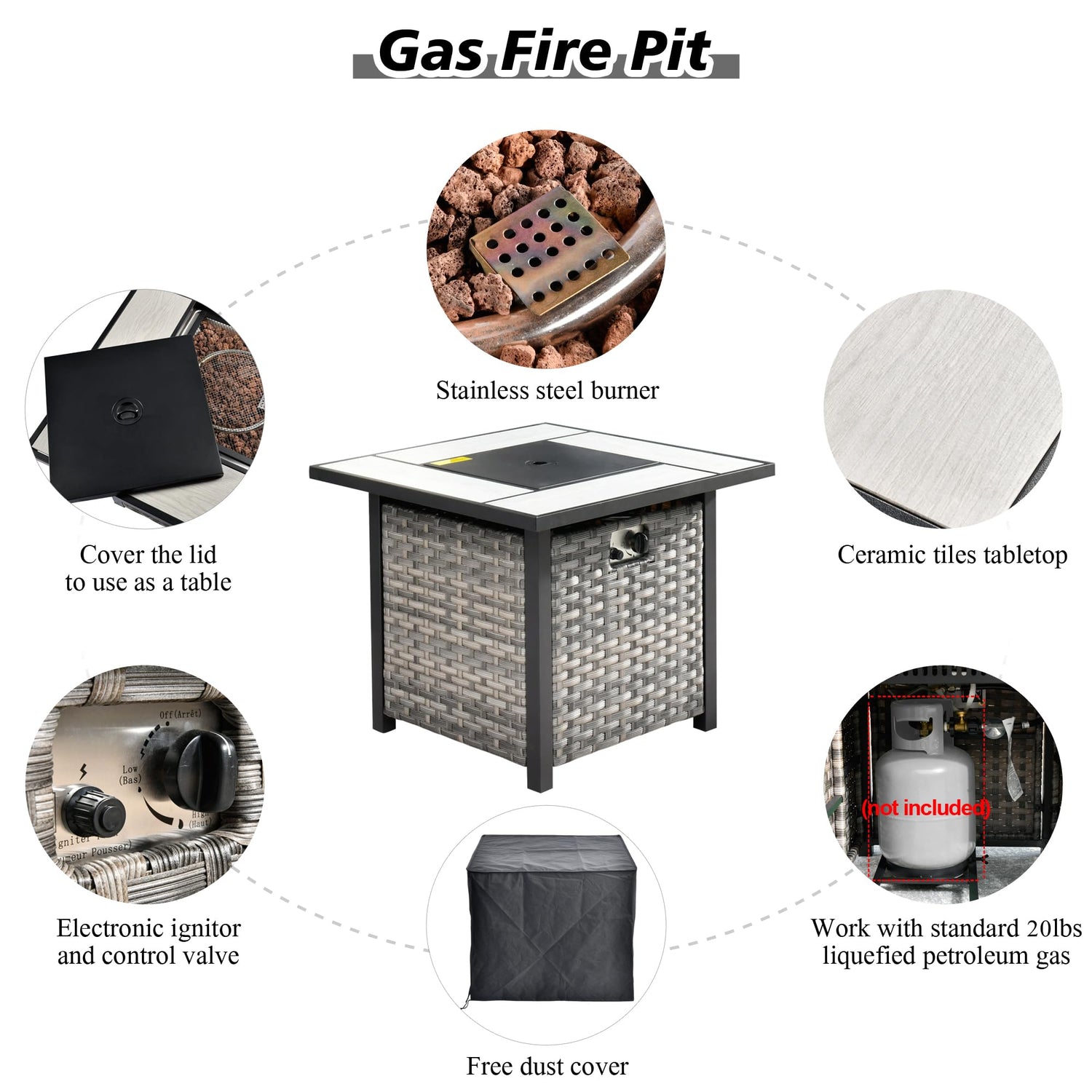 - FirePit Table Included: Comes with a square convertible propane gas fire pit table. Night time use it as a fire pit table to add atmosphere. Day time use it as a tall Dining table with the burner lid. Stainless Steel Burner withstands all weather. CSA certificated for safety.